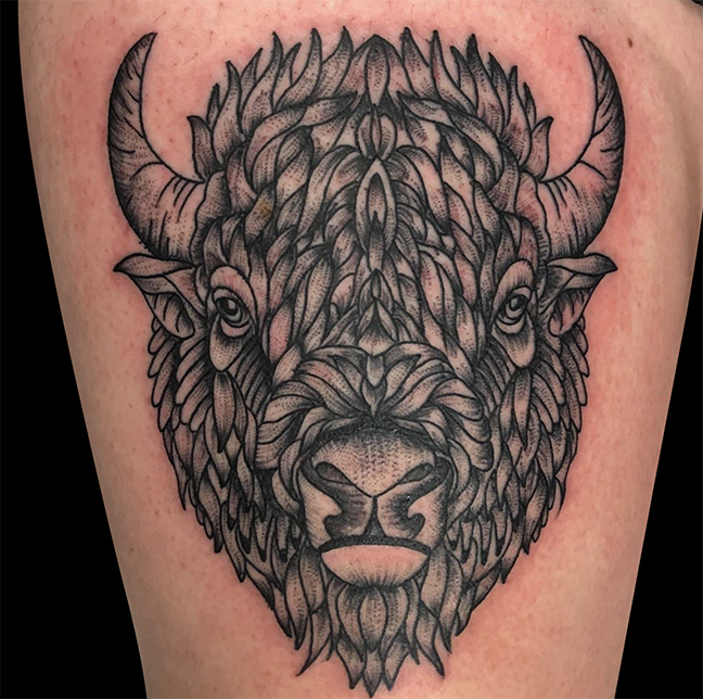 Gabe did a rad tiger head this week. Colin put a skull covered with mushrooms on a client’s arm. Jen tattooed a big black and grey floral piece on a hip. Dan got to do a buffalo head. Casey did some cool rose snakes. Carlos tattooed a little flower on a girl’s arm. Those and more below.