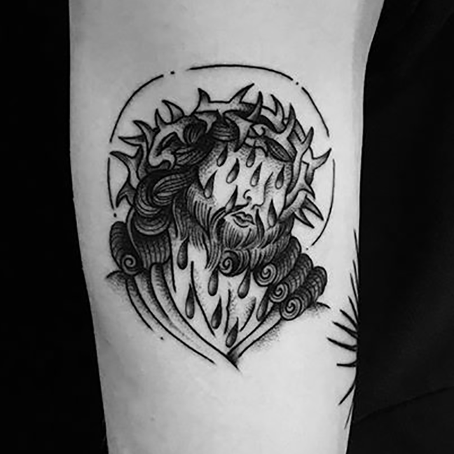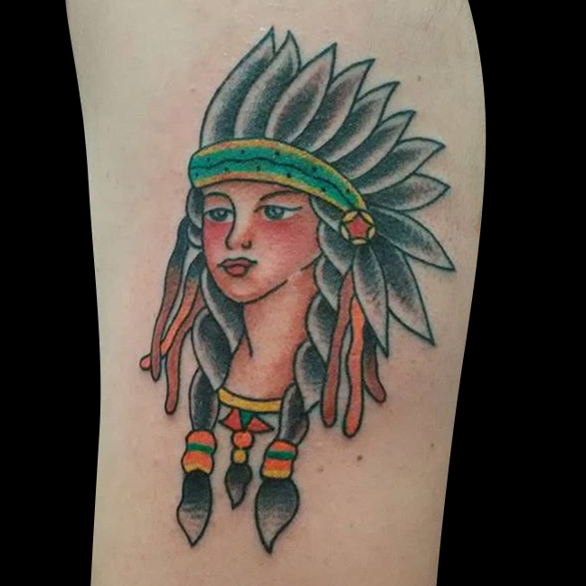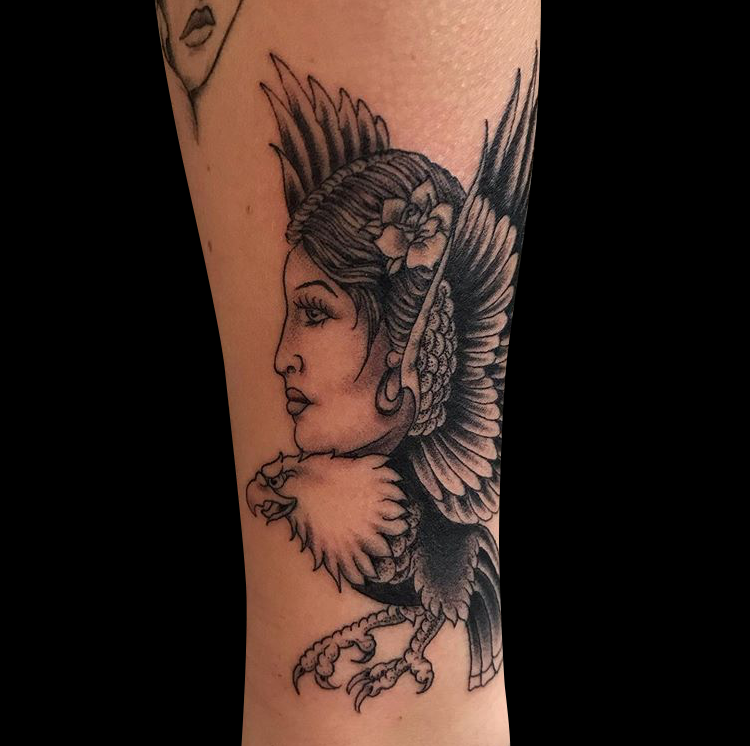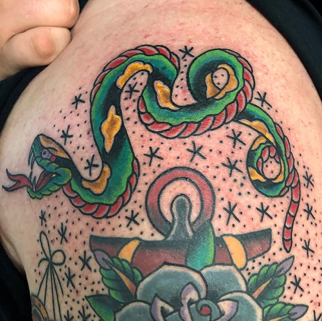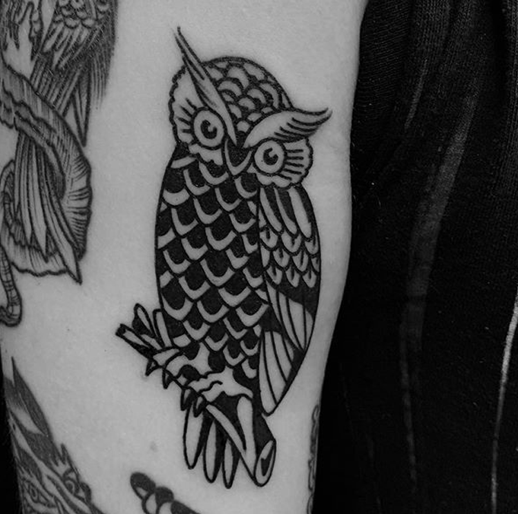 This week Gabe got another session in on an eagle and roses cover up on a dude’s back. Cody finished a traditional sleeve. Colin did a cool little bound hands tat. Dan did a big, ornate mandala on a client’s thigh. Jen tattooed an owl framed in a diamond on one of her clients. Pablo did a graphic mountain sunset. Those and more below.