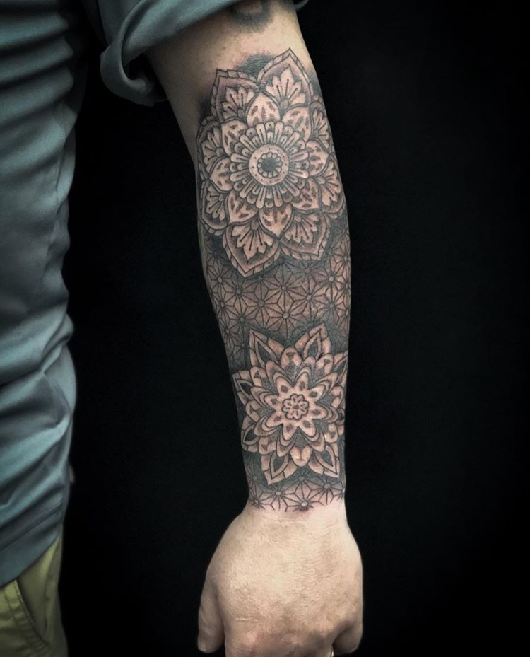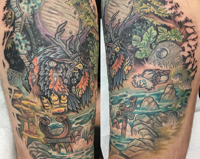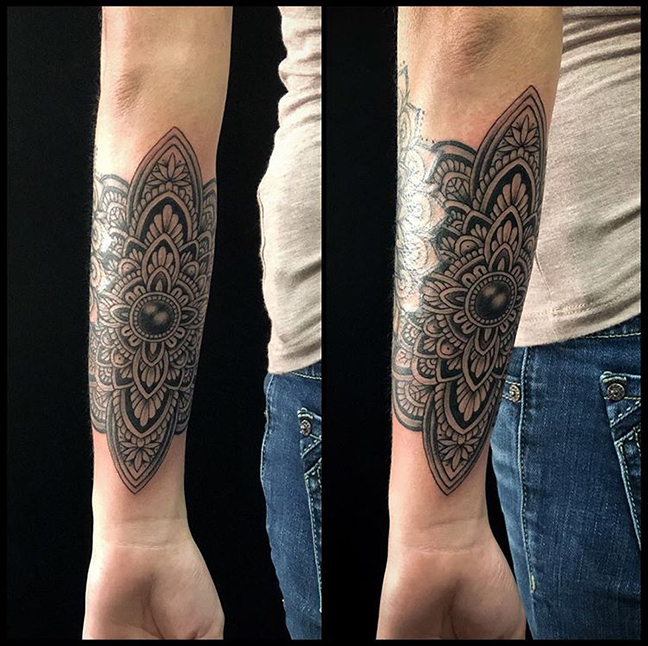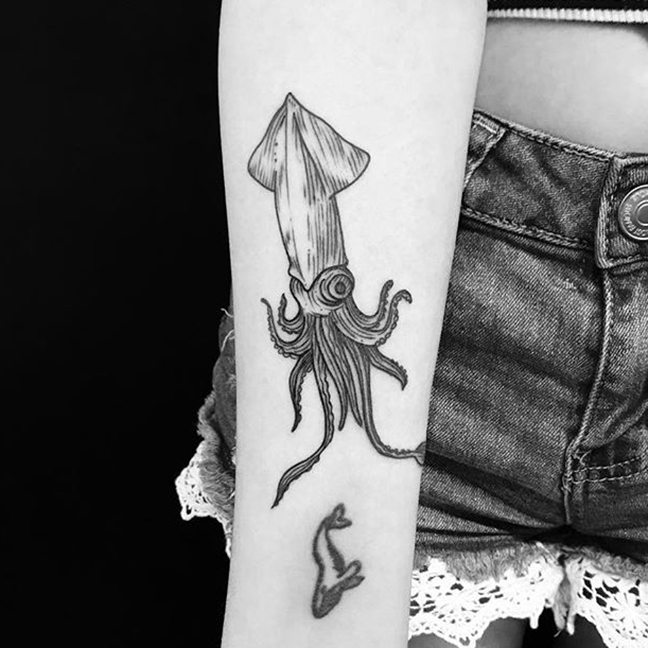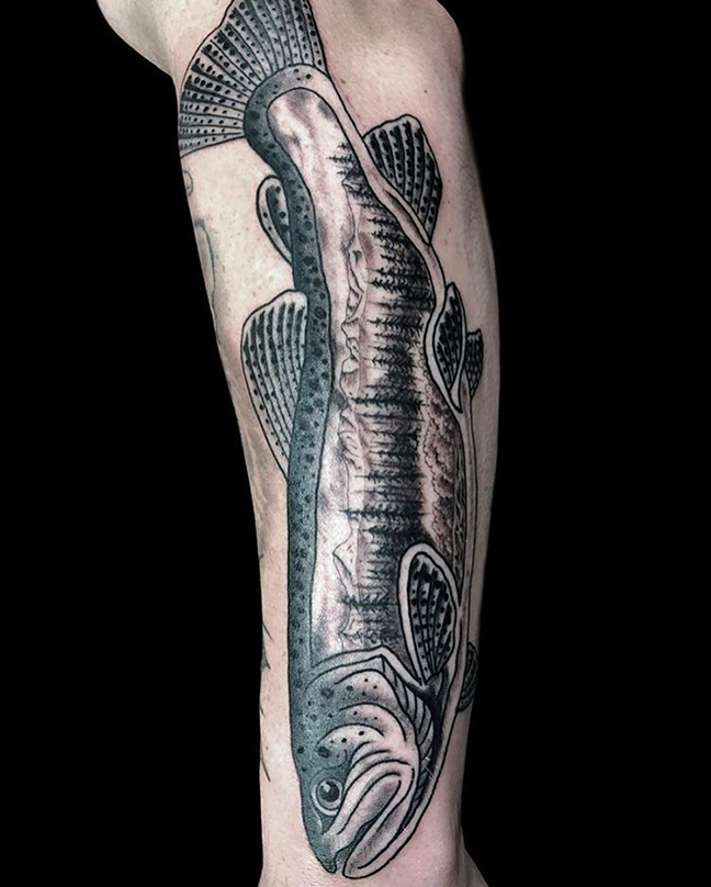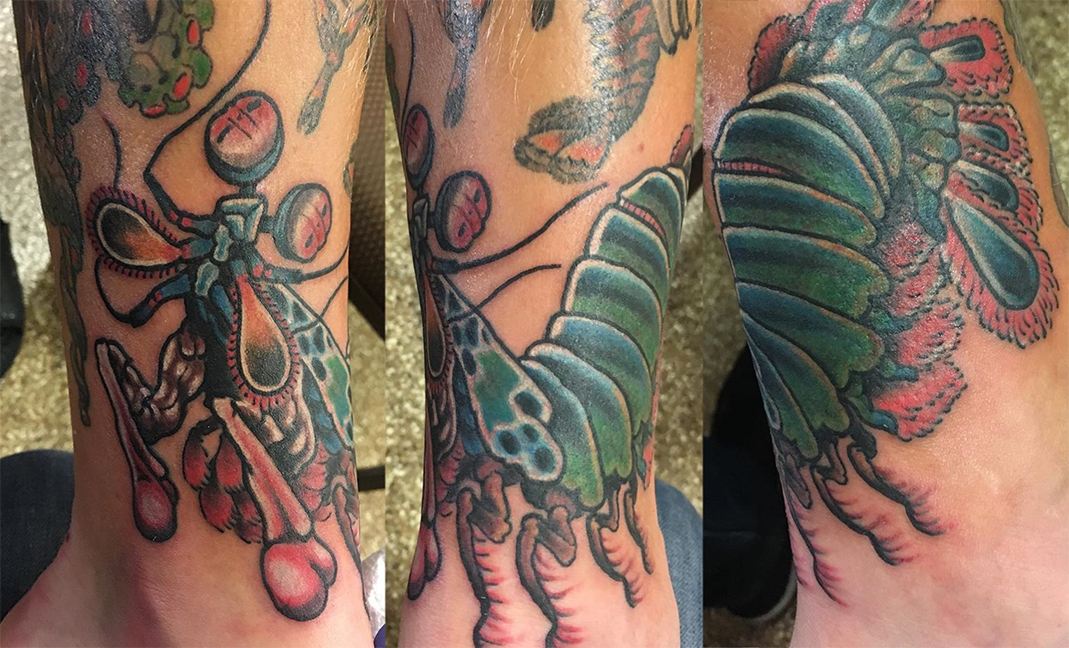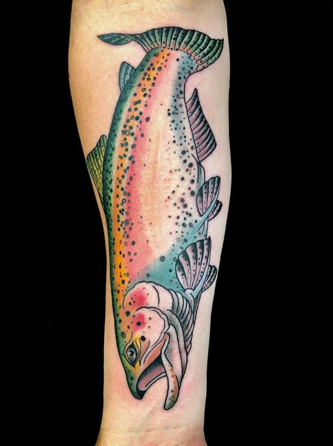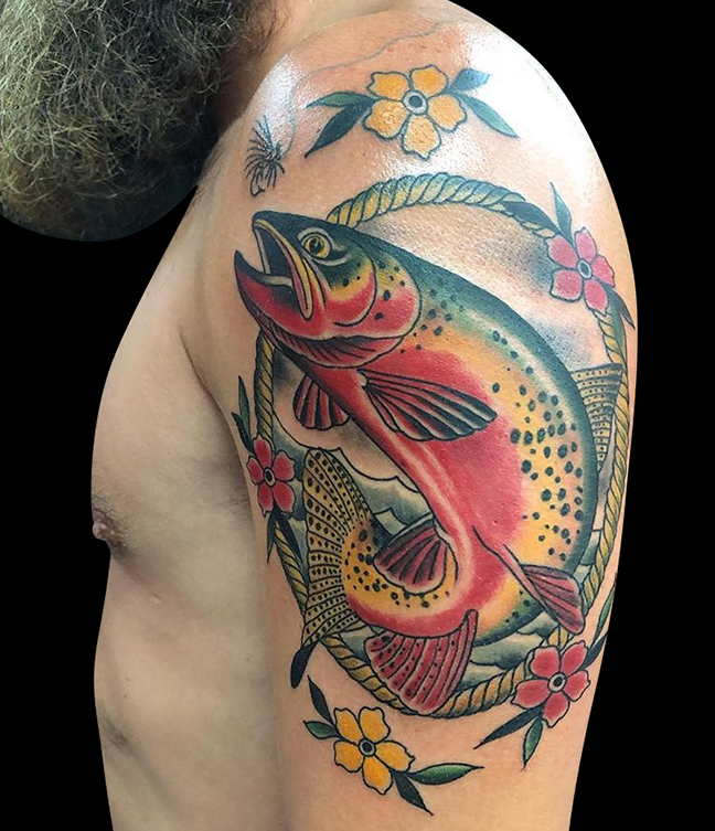 This week Gabe tattooed a rad cutthroat trout on a client’s arm. Cody continued working on an ornate mandala style sleeve. Lars tattooed a peacock mantis shrimp on a regular. Colin got to do a squid tattoo. Dan did a fancy skull with a mustache. Casey tattooed a ram head on a dude’s chest. Pablo did a nice rose and text on a girl’s torso. Those and more below.