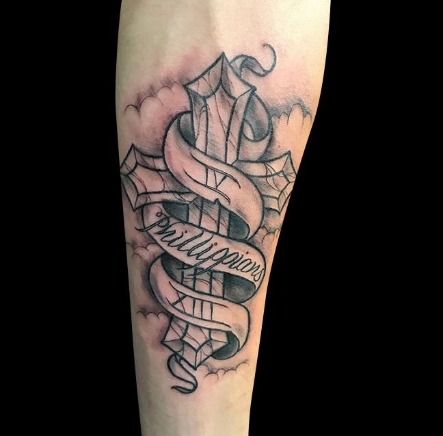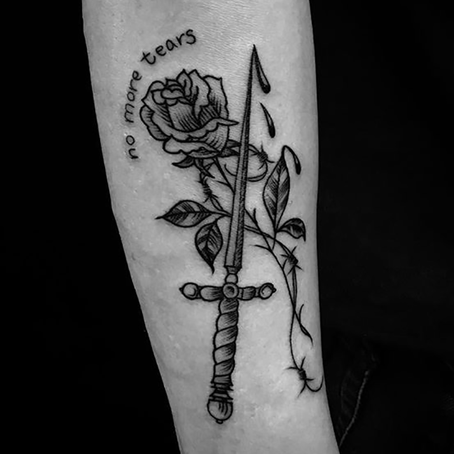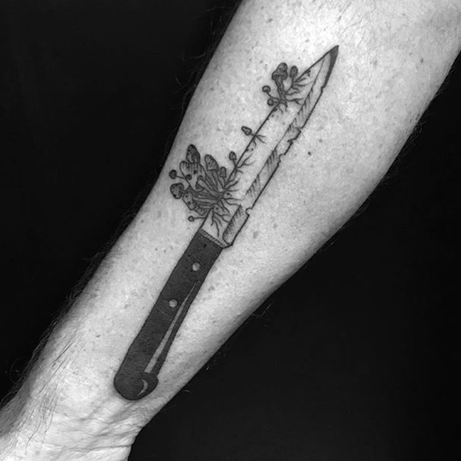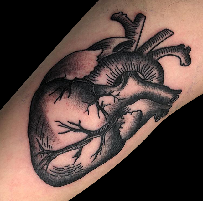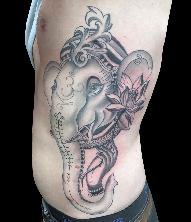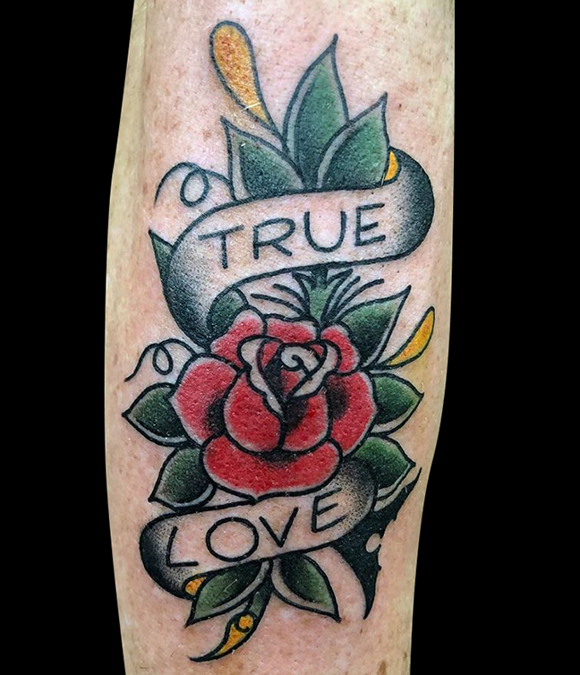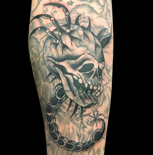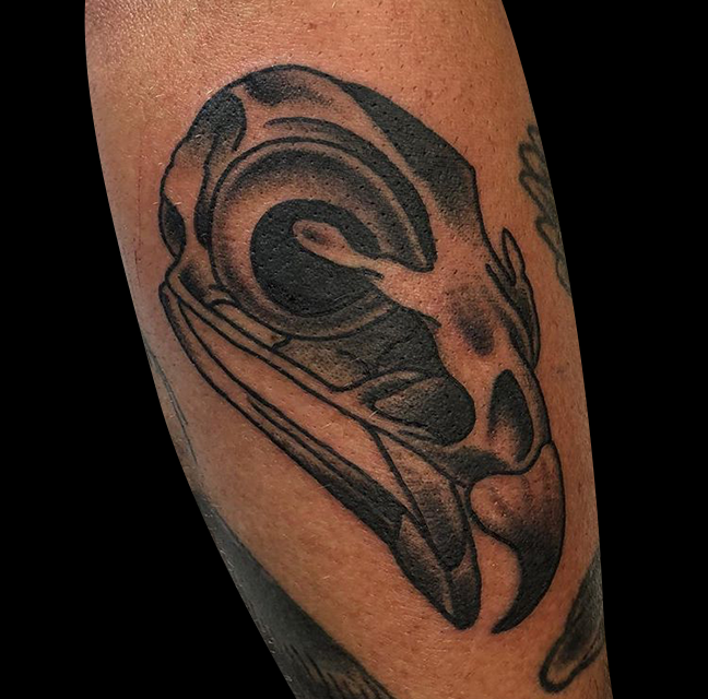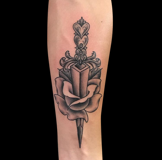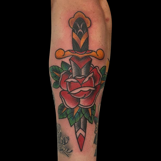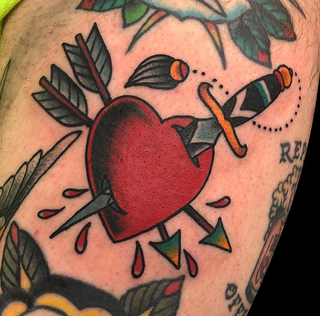 This week Gabe did some Halloween teeth with a rose on a client’s arm. Cody tattooed an owl on a walk-in. Lars put a huge, ornate dagger on our friend’s leg. Colin tattooed a crazy skull/haunted house on the back of an arm. Dan tattooed “the 3 of swords-upright” on a palm. Casey did a rose cover up on a walk-in’s hand. Pablo got to put an elephant one a forearm. Those and more below.