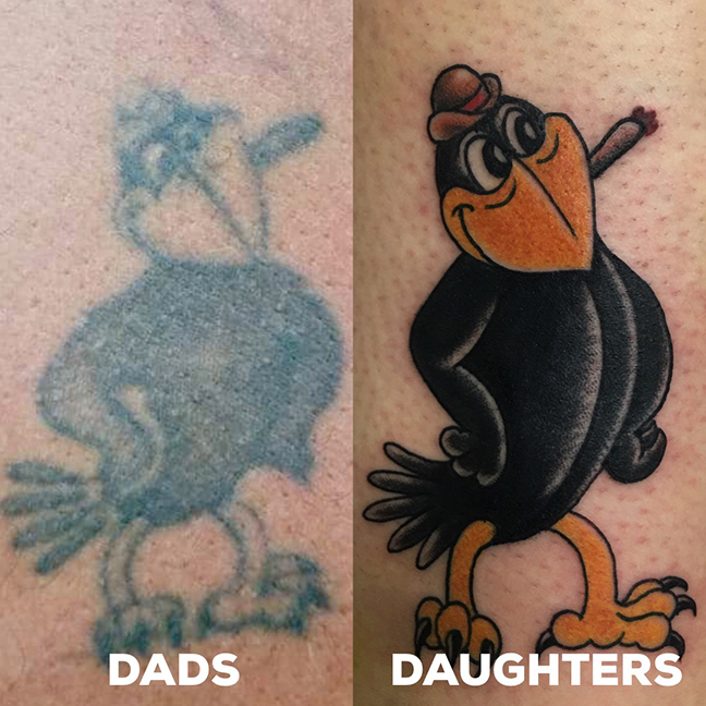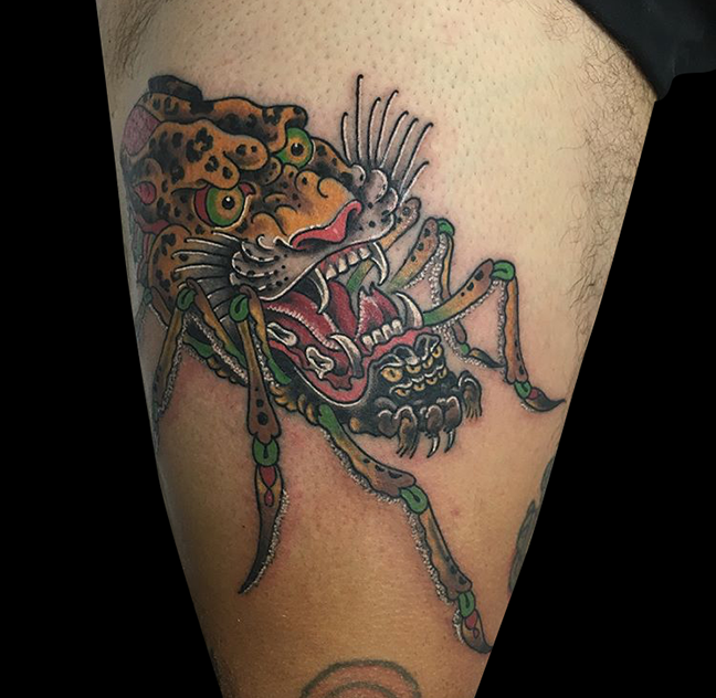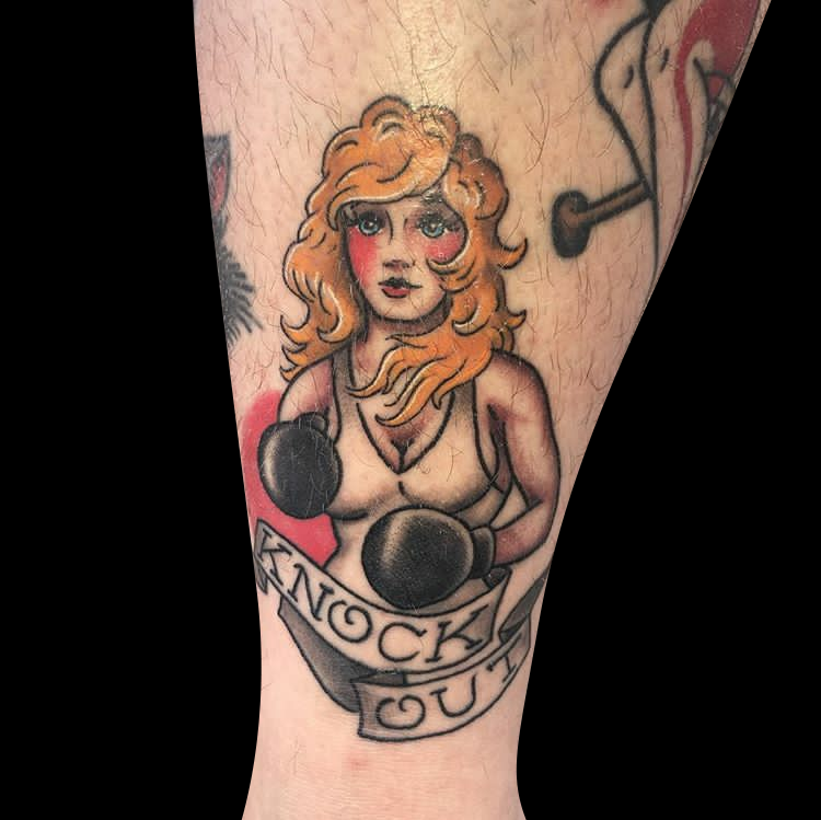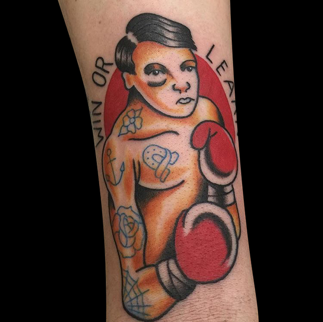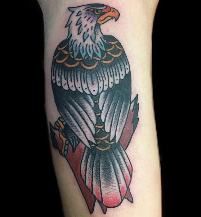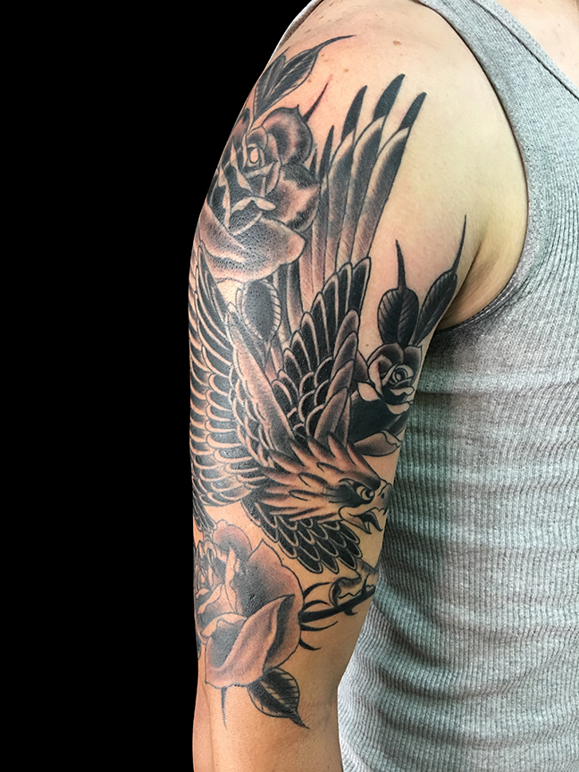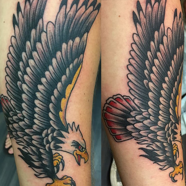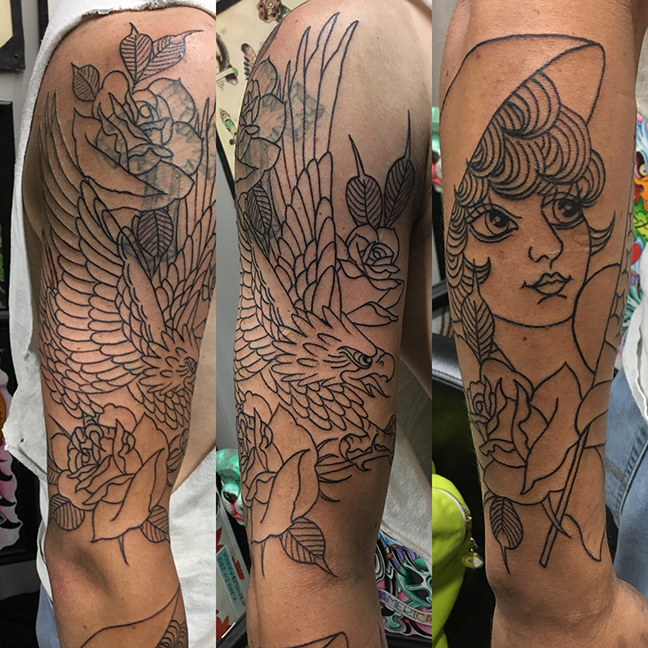 Hey guys, got another update on shop stuff for ya. Gabe got to do a sick Cheetah on a dude’s stomach, did session work on a nautical themed sleeve and tattooed a cartoon crow on a customer to match an old one her father has. Cody outlined a Polynesian-style manta ray on a girl’s back. Colin got to tattoo a black and grey eagle on a client’s chest. Lars got a healed pic of a boxer pinup he did awhile back. Dan put a traditional eagle on a dude’s arm. Jason tattooed a little black rose on a hand. Felix got to do matching fox and owl tattoos.
