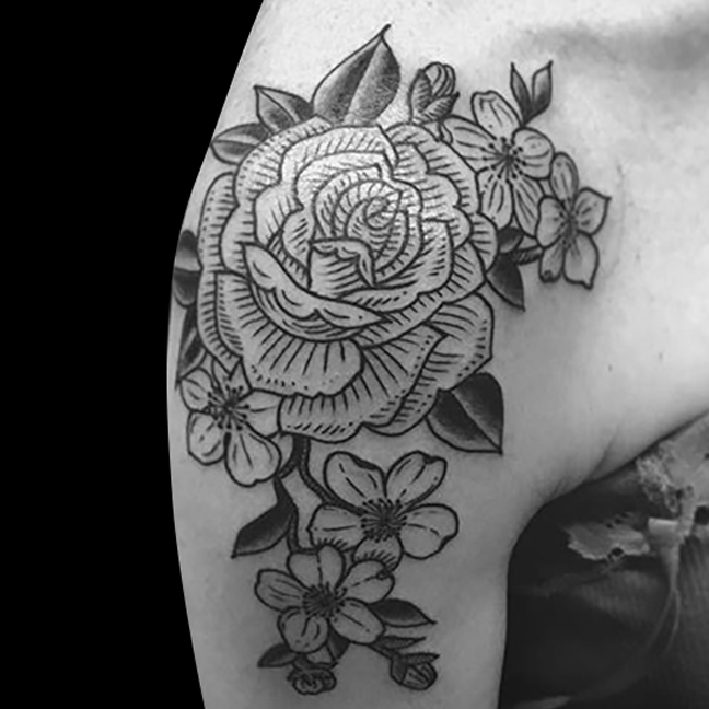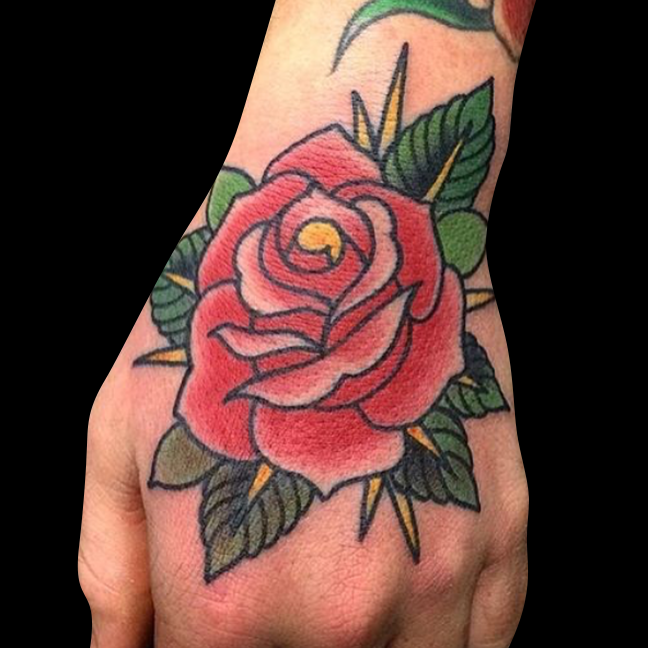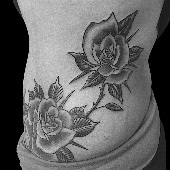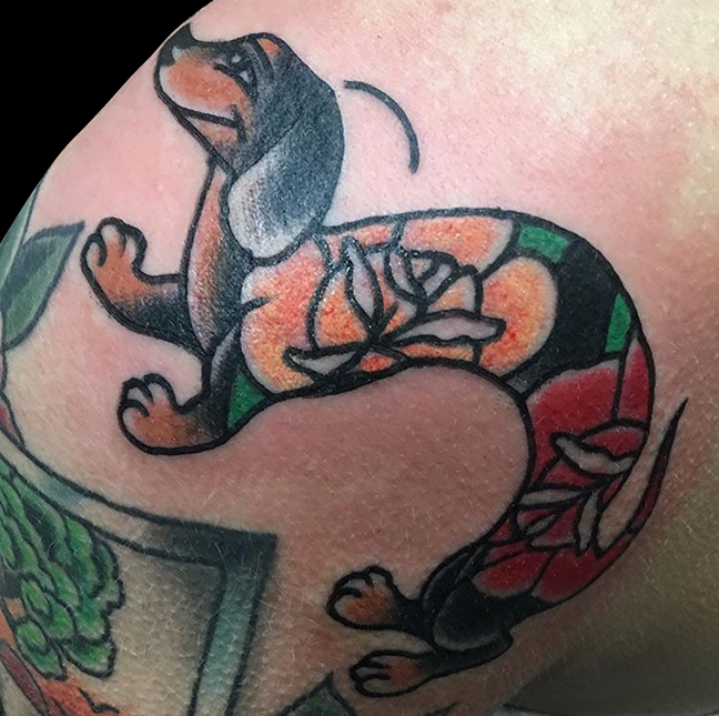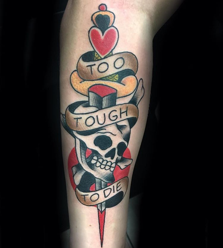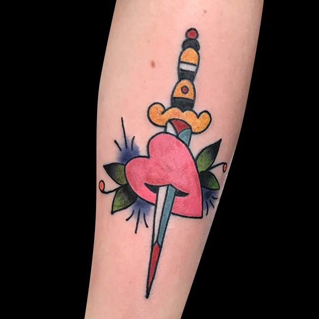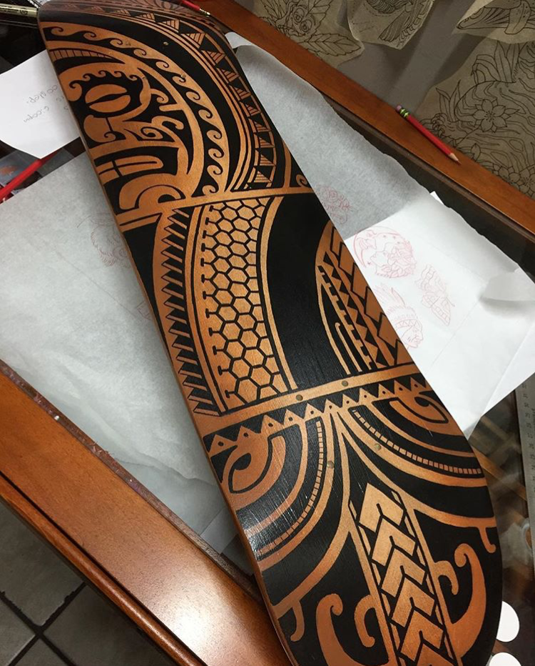 Got another shop update for ya, here we go. Gabe got to do a traditional dagger/skull tattoo along with a Dachshund tattoo. Cody outlined a pirate ship on a client’s thigh and finished painting a Polynesian tribal skateboard. Colin tattooed a skull inside a clover on one of the counter guys. Dan did a rose band under a client’s knee. Jason did a floral sternum tattoo, a traditional shield and a rose on a hip. Felix got to do several different rose/floral tattoos. Take it easy guys.