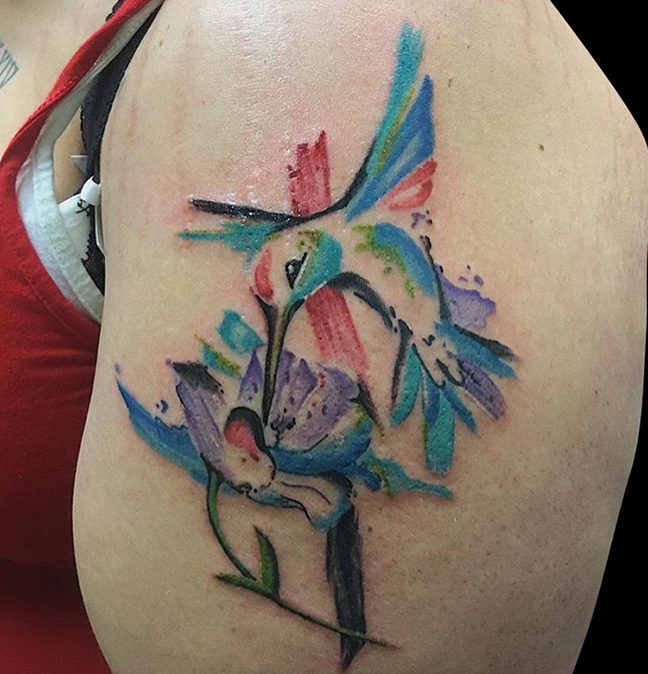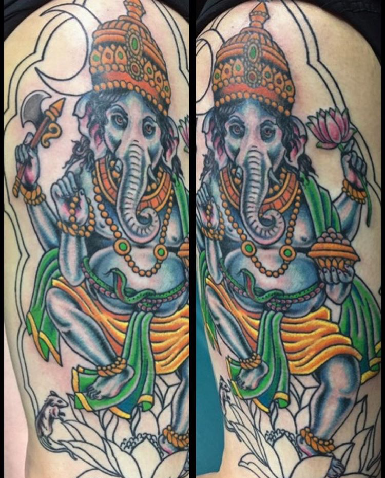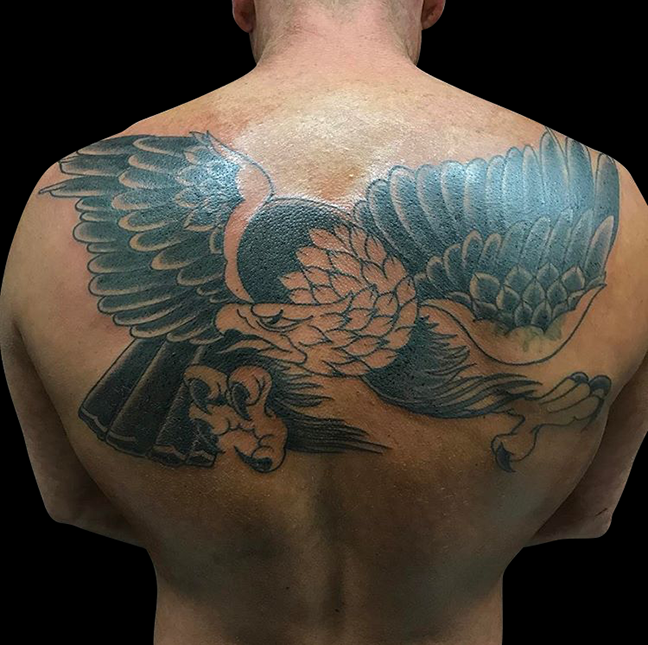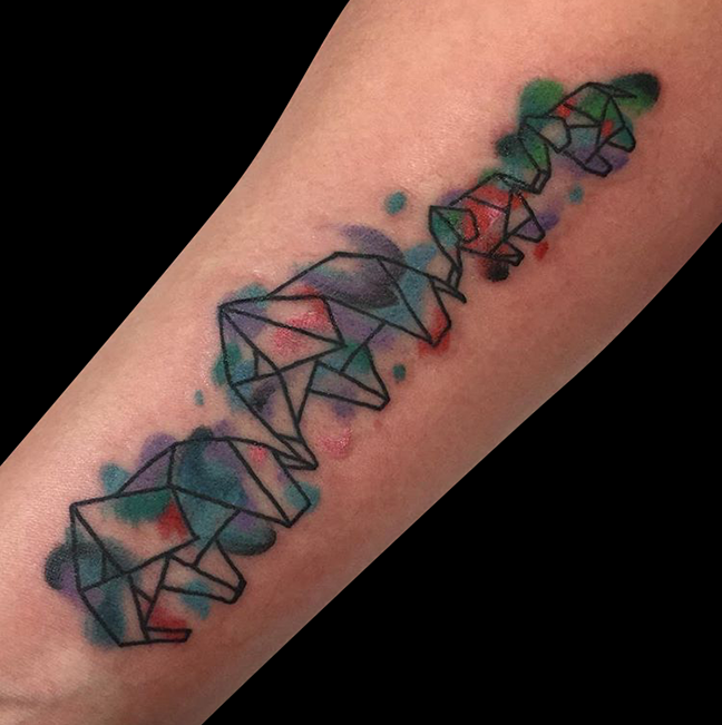 Here’s the weekly shop update guys. Gabe got to work on some cool american traditional pieces including a flag and eagle, a tiger head and a little Sailor Jerry shark. He also did another session on a sleeve and did some text on a client’s arm. Cody tattooed a huge black and grey angel on a client along with session work on a Ganesh thigh tattoo, a Polynesian tribal arm band and some flowers on a girl’s sternum. Colin got to tattoo some nice black and grey flowers on a walk-in. Dan did some watercolor geometric elephants. Phil started a massive eagle cover up on a dude’s back. He also tattooed a dog memorial piece, a hammer with text and a rose on a guy’s chest. Jason tattooed an ornate mandala on a walk-in’s wrist as well as the Chiefs logo and some hearts with banners. Casey did a skull and crossed bones on a dude’s hand. Felix got to do a watercolor humming bird tattoo and some flowers.