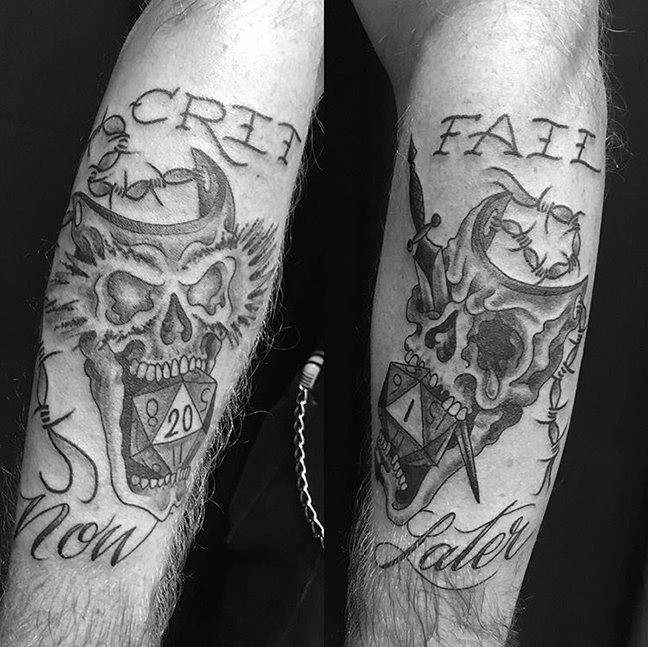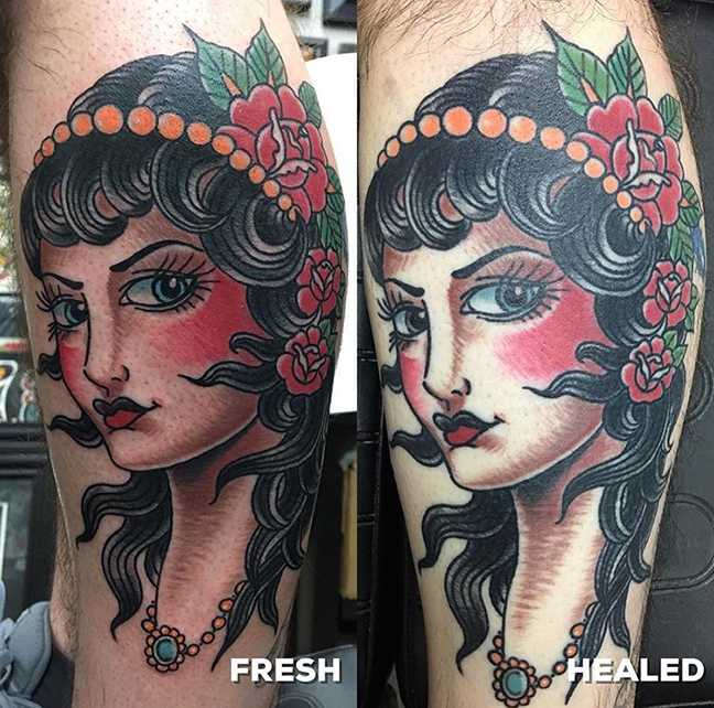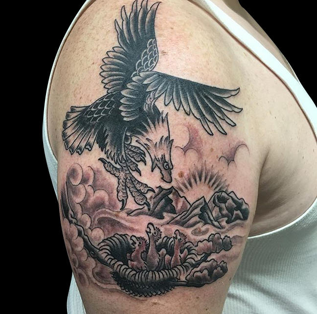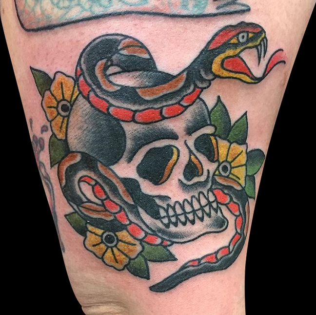 Happy New Year everyone, thanks for checking out this week’s shop update. Gabe got to tattoo a satanic goat head on a customer’s knee while guest spotting at Broken Dagger Tattoo in Vegas. He did a traditional girl with flowers when he got back. Cody tattooed a black and grey police badge with wings on a client’s shoulder. Colin got to tattoo a moth on a branch on our counter guy’s girlfriend. He also did a try-faced girl head on one of his regulars. Dan got to do another session on a traditional deer half sleeve. Casey did a bearded lady tattoo as well as a Cheshire Cat face. Jason got to do a rose on a hand and a feather. Phil tattooed a big Evenstar on a customer’s thigh. Felix did a reaper head and scythe on a shoulder.