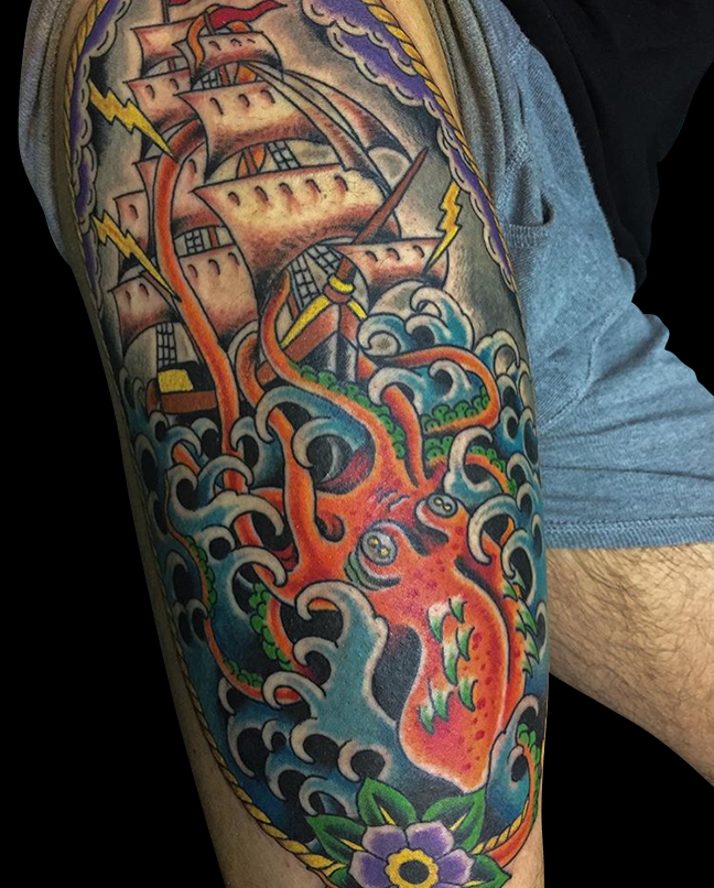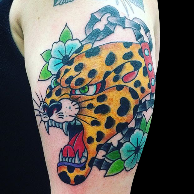 It’s Tuesday and we’re Iron Tiger so here we go. Gabe finished a black and grey portrait/memorial half sleeve. Cody finished a traditional clipper ship/Kraken thigh panel. Lars got to tattoo an eagle feeding its chicks on one of his friends. Colin tattooed a satanic Hannya mask and an ornate cat silhouette on a couple of his clients. Dan got to do a traditional snake with flowers and some roses on a customers wrist. Jason tattooed a huge cheetah head on an arm and an ornate flower on a clients rib. Phil got to do a Buddha half sleeve. Enjoy the pics.