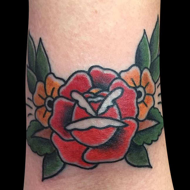 This week Gabe did a globe tat to fill in so space in a traditional sleeve. Dan tattooed a tree with axes, a bull skull, an “0k” hand and some text on an arm. Jason covered up a little anchor on a wrist with a nice traditional rose. Casey tattooed some sunflowers on a customer. Felix did a black and grey girl head and some preying hands along with finishing a pirate back piece painting.