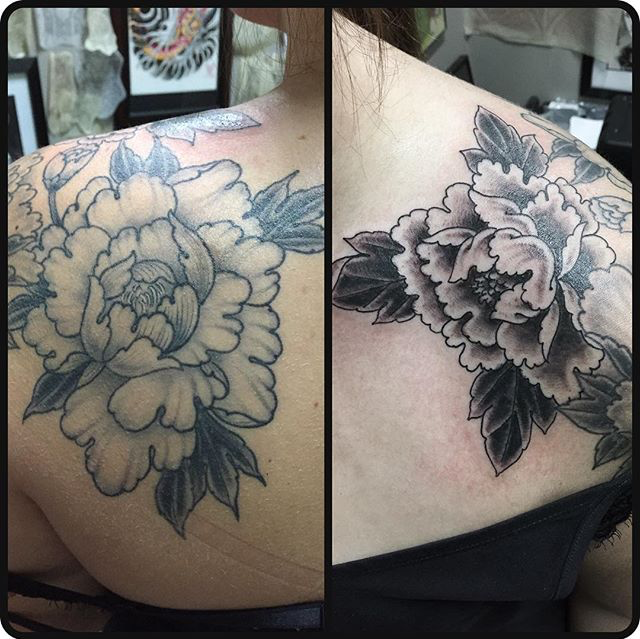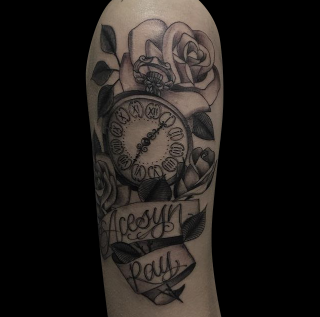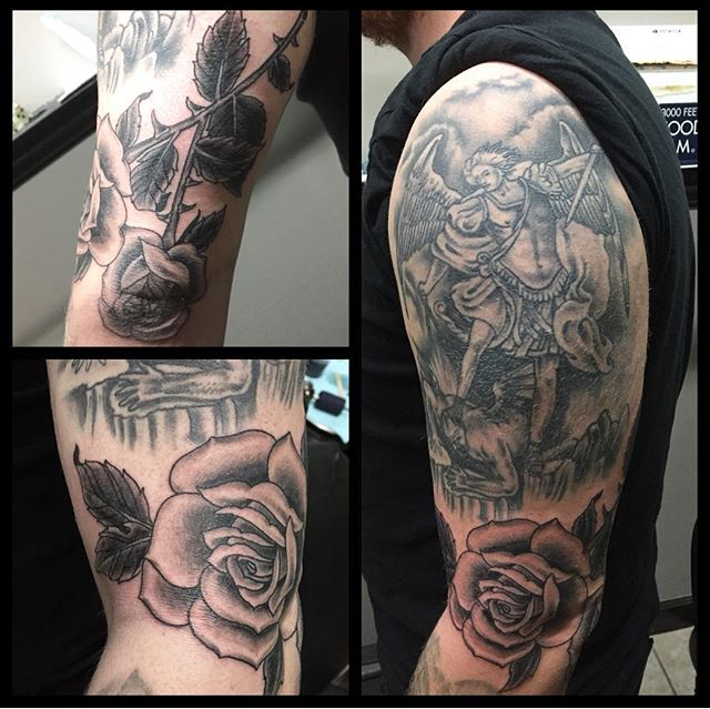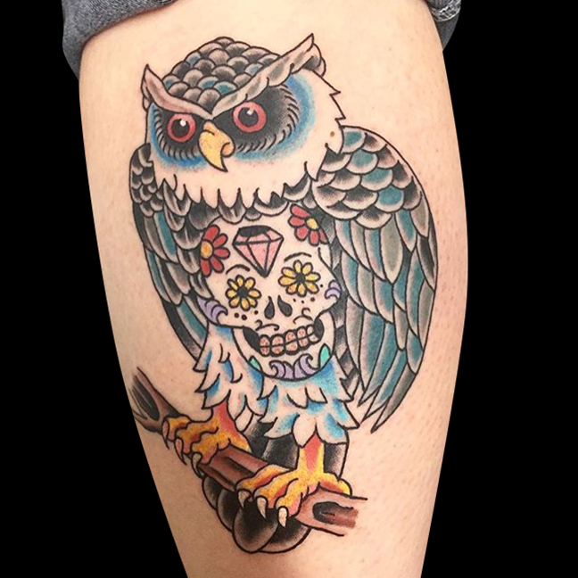 Hey guys, here’s what we were up to this week. Gabe did some session work on a couple different tattooed he’s been working on. He also tattooed an owl on a woman’s chest and a rose on a shoulder. Colin tattooed a bear on a client’s shin. While covering shifts at Iron Age in STL, Morgan tattooed a sugar skull and a black and grey skull and watch. Phil started a Transformers tattoo and did an Animal Farm pig head on a client’s back. Alysha tattooed a Gypsy Girl head on a walk-in. Dan got to tattoo a through-and-through dagger on a customer’s legs. Moe tattooed an ornate mandala-esque design on an arm. Felix tattooed some humming bird silhouettes, some watercolor feathers, a scale and an ornate arrow. Enjoy the pics.