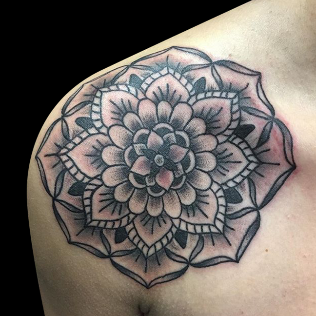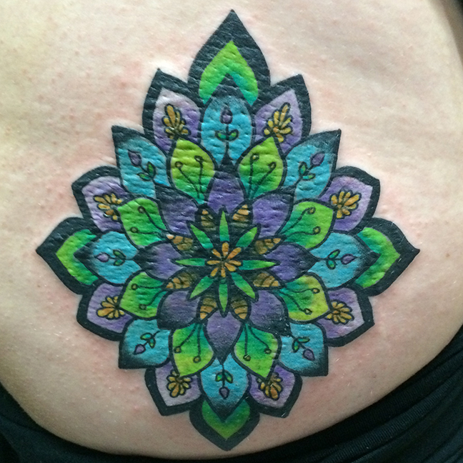 Thanks for taking a look at this week’s update. Gabe got back from LA this week. He did another session on a sleeve he’s had in the works for awhile. I’ve got pics from his guest spot at Spotlight as well. Lars got to do a wizard tat and a bearded lady. Cody outlined a Ganesh half sleeve and tattooed some lobster bro tats, an owl and a deer skull. Colin tattooed a nail cross with flowers and a black and grey landscape. Dan tattooed a tiger head on a knee cap and finished a painting. Alysha did a huge mandala stomach tat and a landscape wristband. She also got a healed pic of a native girl head she did. Moe tattooed a panther head and a cardinal. Enjoy the pics.