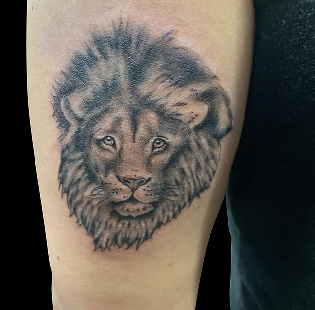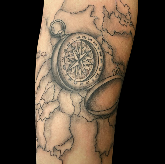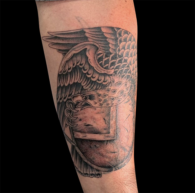 Gabe worked on a lion half sleeve this week. Colin did a reaper on a dude’s hand. Dan got to do a cool traditional plague doctor tat. Carlos covered up an old tattoo with a black and grey eagle and shield. Pablo did a compass tat with a map background. Casey got a healed pic of a suicide king he did. Those and more below.