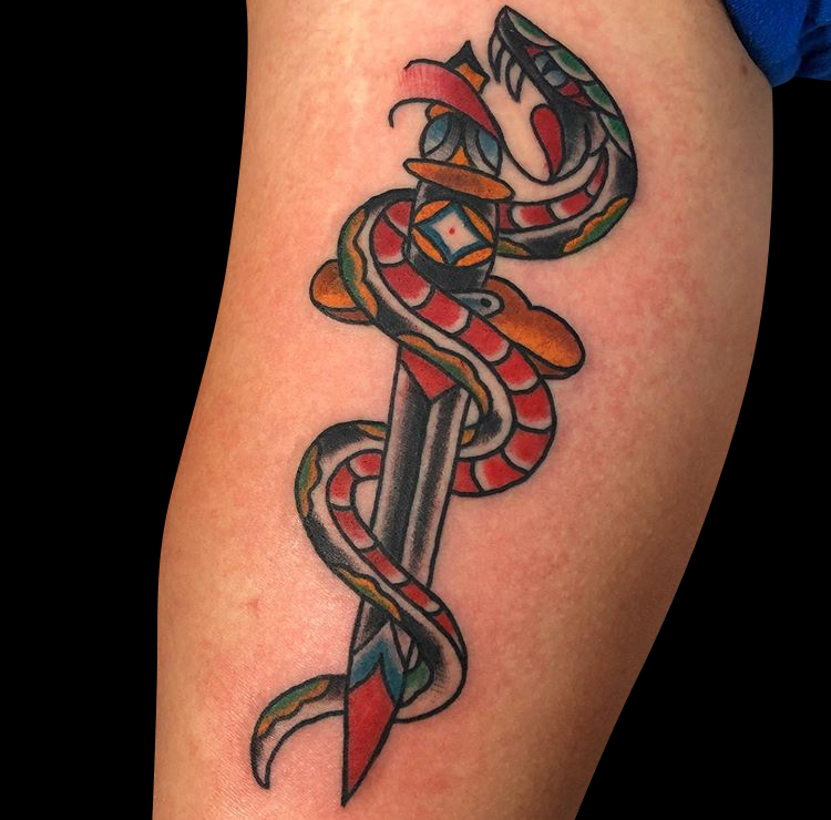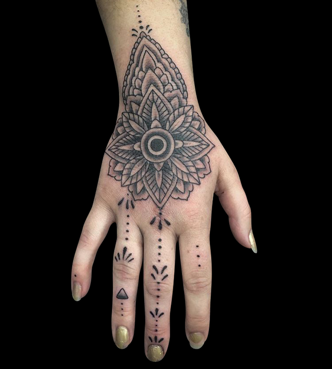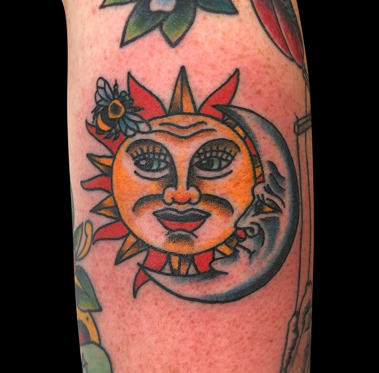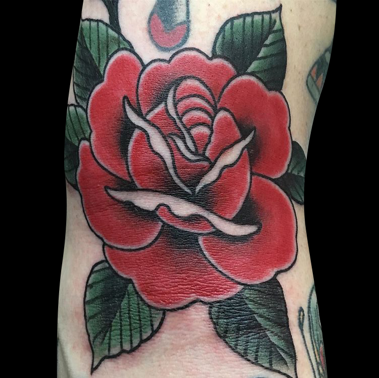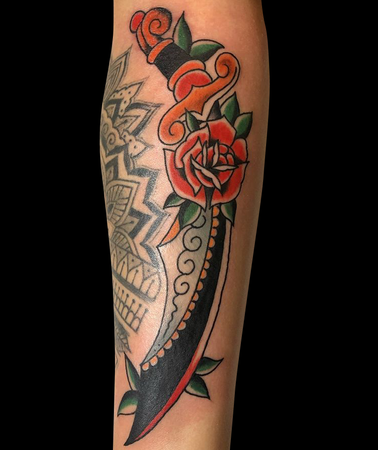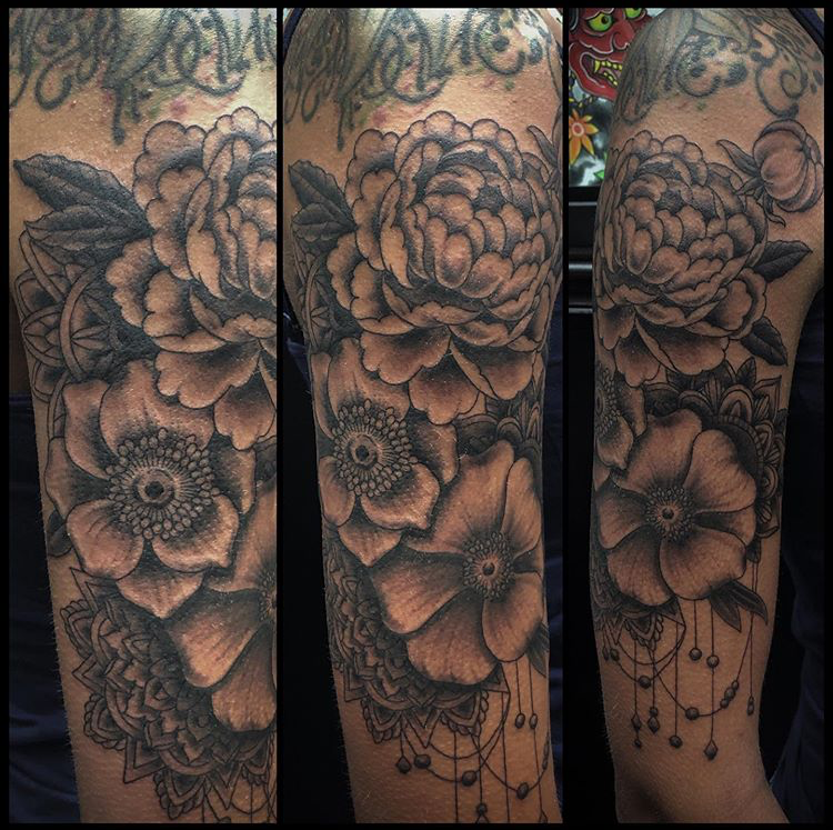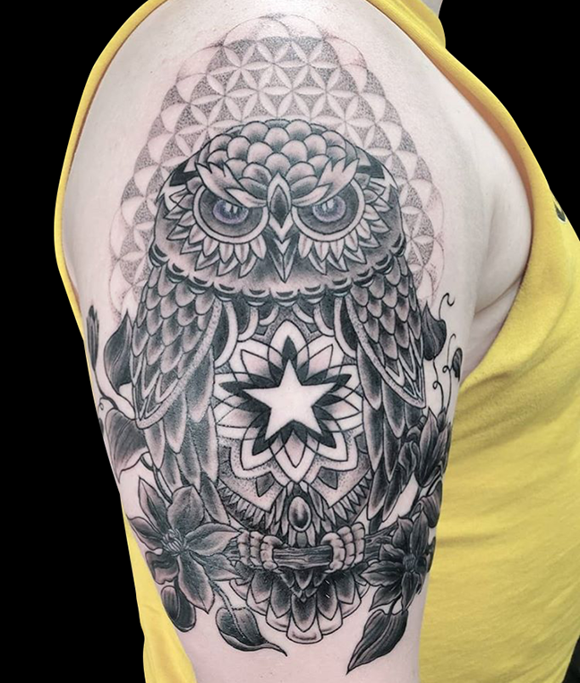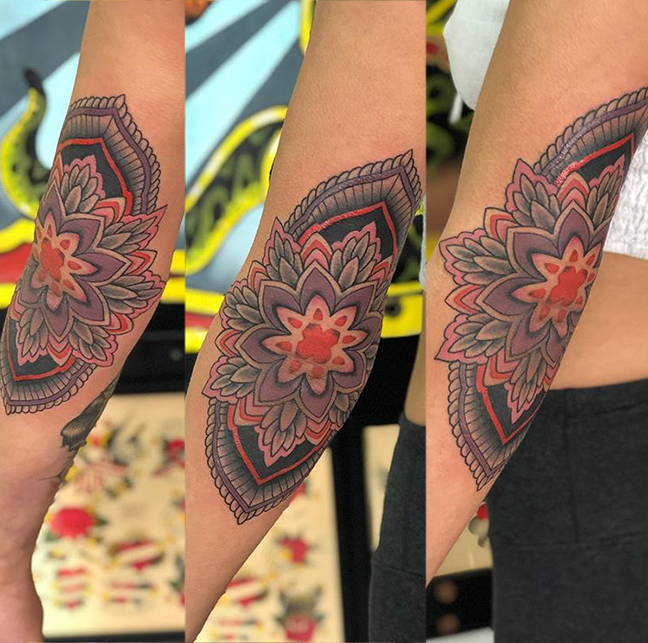 This week Gabe got another session in on an eagle and roses cover up on a dude’s back. Cody finished a traditional sleeve. Colin did a cool little bound hands tat. Dan did a big, ornate mandala on a client’s thigh. Jen tattooed an owl framed in a diamond on one of her clients. Pablo did a graphic mountain sunset. Those and more below.