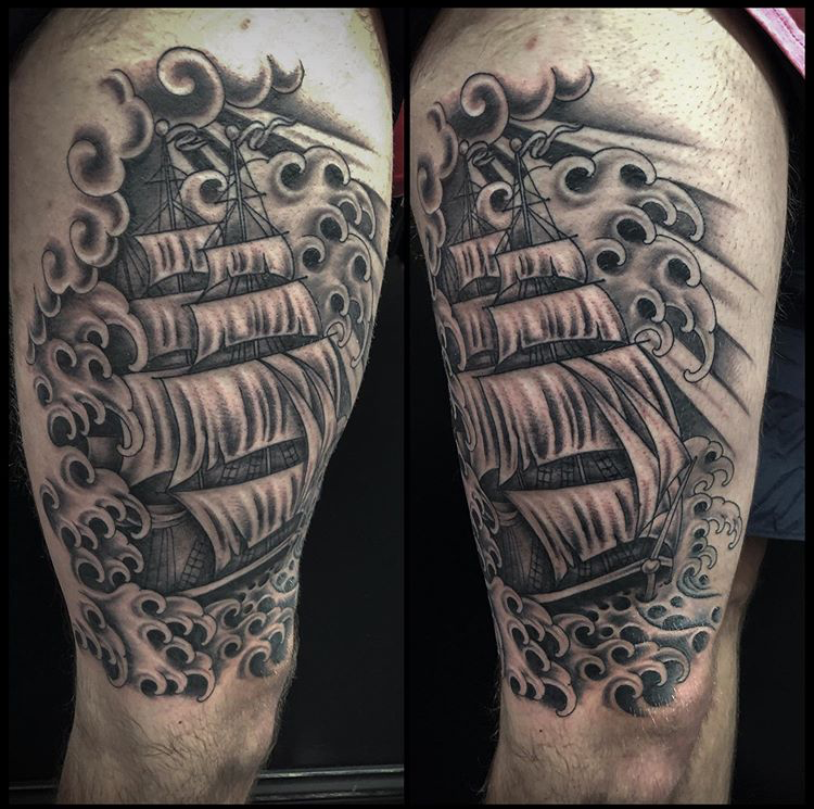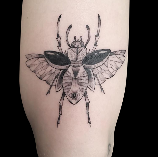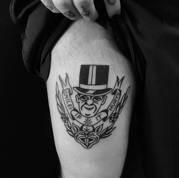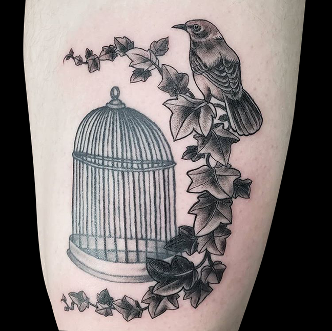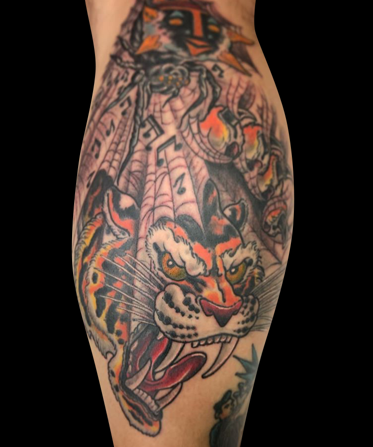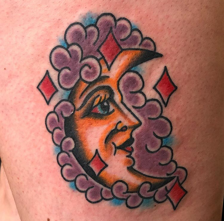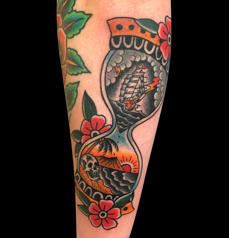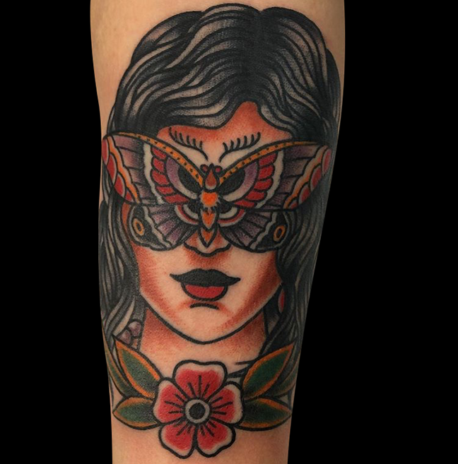 This week Gabe got another session in on an eagle and roses cover up on a dude’s back. Cody finished a traditional sleeve. Colin did a cool little bound hands tat. Dan did a big, ornate mandala on a client’s thigh. Jen tattooed an owl framed in a diamond on one of her clients. Pablo did a graphic mountain sunset. Those and more below.