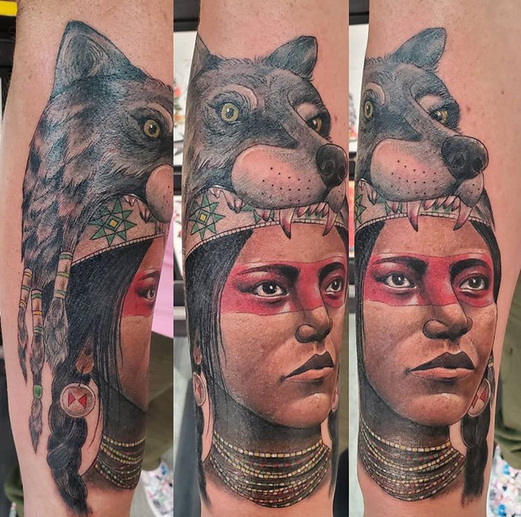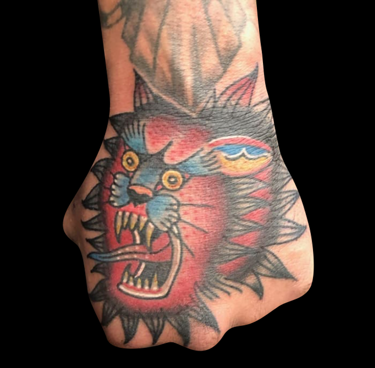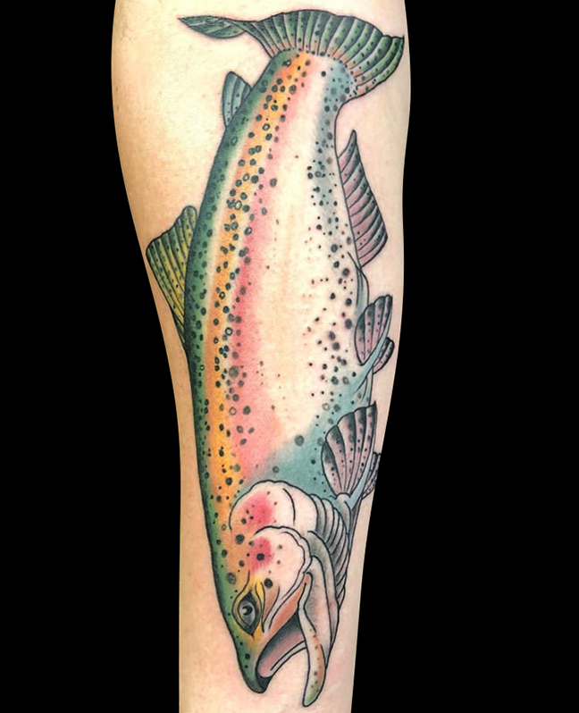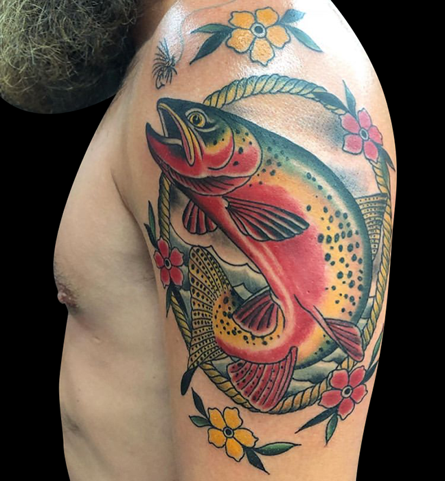 I put up an old pic of a cool cutthroat trout Gabe did a while back. Colin did some old english text on a girl’s stomach. Jen did a native girl with a wolf head dress. Dan got to do a butterfly girl head. Casey tattooed a crazy lion on a dude’s hand. Pablo did an anatomical heart with a banner.