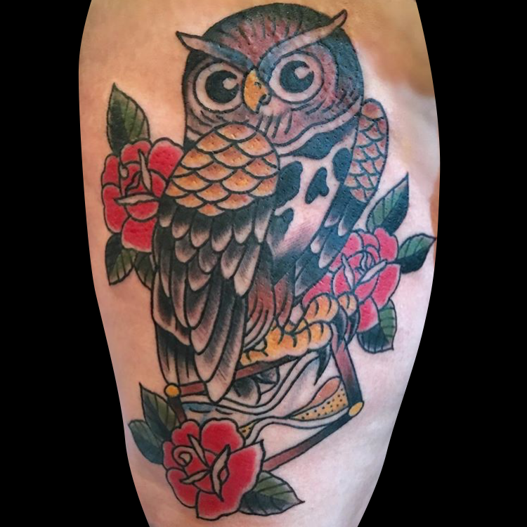 Hey guys, thanks for checking out this week’s shop update. Gabe got to do some cool tattoos at the Roc City Tattoo Expo including a traditional owl, a Samurai skull and a bird cage. Colin tattooed a siamese cat on an arm and a rose on a hand. Morgan tattooed a horseshoe and the Jameson logo. Casey got to do a traditional snake charmer tattoo. Phil tattooed a Kewpie on one of his regulars. Dan tattooed a sunflower with a stipple-shaded mandala center and started some traditional roses. Moe got to do a traditional rose as well. Felix tattooed some text on a customer’s ribs and a heart on the back of a dude’s neck. Have a good week guys.