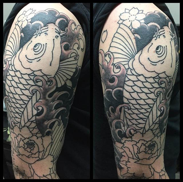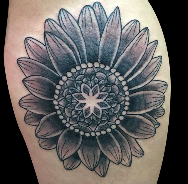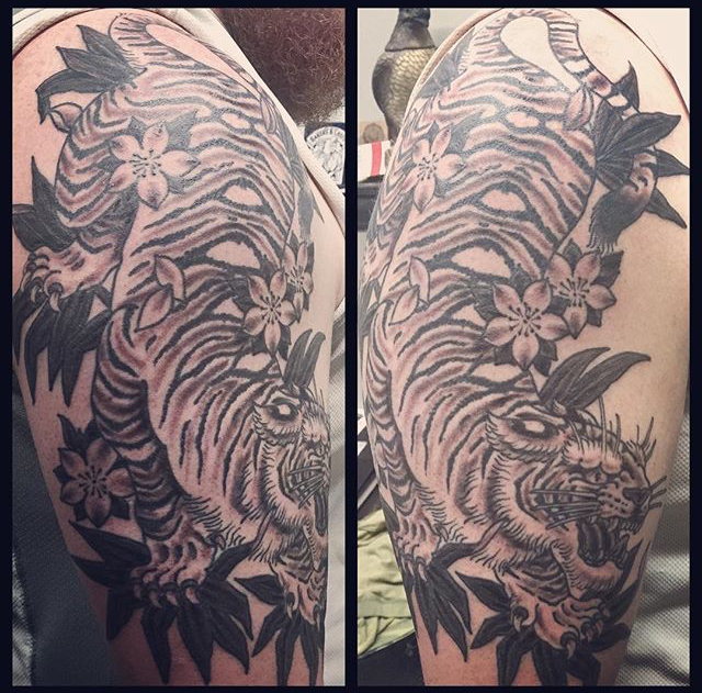 Well here we are again guys, it’s Tuesday and I’ve got another shop update for you. Gabe finished a dragon half sleeve and a black and grey gypsy girl/moon. He also did a traditional mermaid and a ship. Cody did a black and grey koi and started a tiger half sleeve. Colin tattooed a frog playing a banjo. Phil started an anatomical Ganesha back piece. He also tattooed an Alice in Wonderland illustration and a big mandala. Dan tattooed a heart in a bottle, a traditional hand with flowers, an arrowhead behind an ear and a midwest hardcore tat. Morgan tattooed the Duck Hunt dog on a customer’s waist. Moe tattooed a flower on a client’s arm and a Buddhist symbol on a sternum. Casey tattooed a sugar skull on a leg. Alysha got to do a black and grey rose. Felix did some small flowers with text on a ribcage. Have a good week guys.