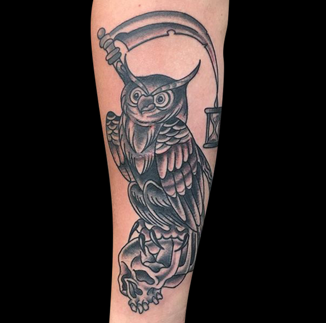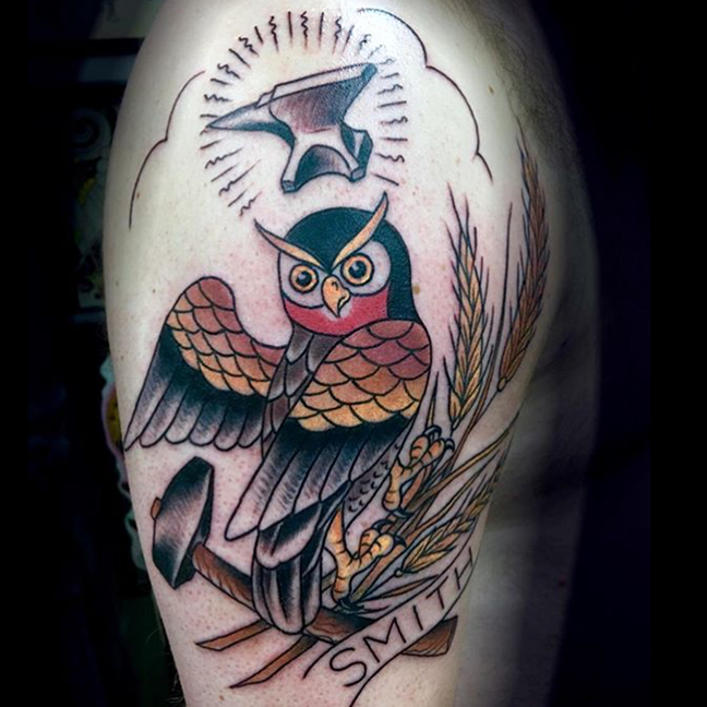 Hey guys, here’s what we were up to this week. Gabe did some session work on a couple different tattooed he’s been working on. He also tattooed an owl on a woman’s chest and a rose on a shoulder. Colin tattooed a bear on a client’s shin. While covering shifts at Iron Age in STL, Morgan tattooed a sugar skull and a black and grey skull and watch. Phil started a Transformers tattoo and did an Animal Farm pig head on a client’s back. Alysha tattooed a Gypsy Girl head on a walk-in. Dan got to tattoo a through-and-through dagger on a customer’s legs. Moe tattooed an ornate mandala-esque design on an arm. Felix tattooed some humming bird silhouettes, some watercolor feathers, a scale and an ornate arrow. Enjoy the pics.
