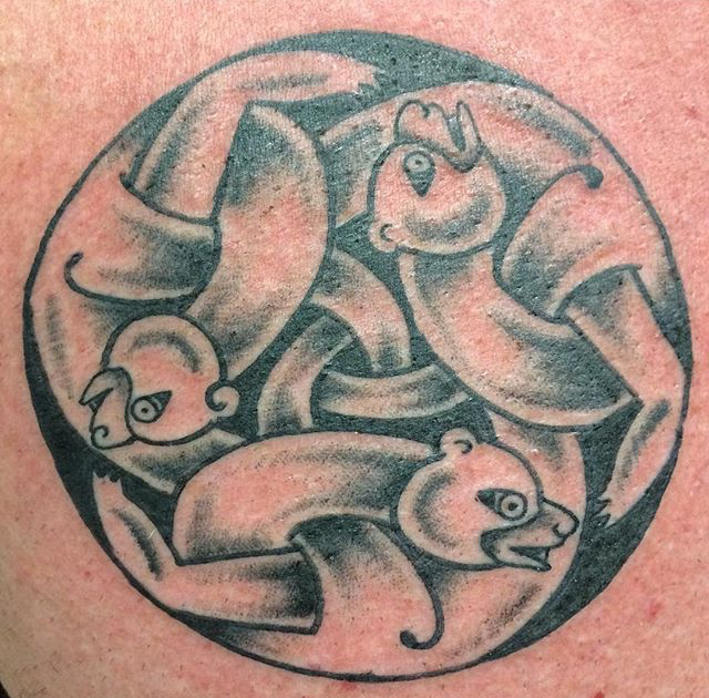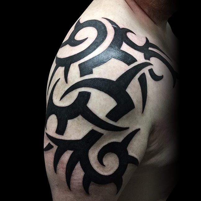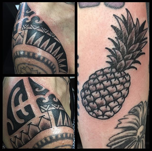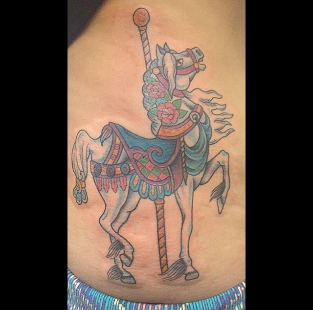 Thanks for checking out this evening edition of the weekly update. This past week Gabe started a huge black and grey sugar skull on a client’s thigh. Cody worked on several different tribal designs as well as tattooing a snake and a pineapple. Phil got to do a bunch of cool tattoos including traditional lighthouse/storm heads, the velveteen rabbit, a cowboy cross and some celtic knot bears. He also finished a small painting. Alysha outlined a cowgirl on a customer’s thigh. Dan tattooed a small single-needle rose. Morgan did a big Disney carousel horse on a rib cage. Moe tattooed a skin rip fish hook. Enjoy the pics.