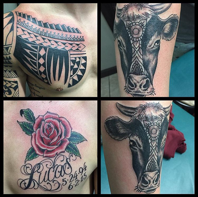 Thanks for checking out this week’s shop update. Gabe got to tattoo some roses on a client’s arm as well as some black and grey lilies. Cody did a session on a Polynesian chest panel along with a cow head and a rose with text. He also did a little filler piñata on his sister’s arm. Colin did a crazy bat with geometric background on a client’s back. Phil got to do a little Sailor Jerry Octopus. Dan started a floral cover up on a forearm, did a rose on an elbow and did some small single-needle flowers with leaves. Jason got to do a black and grey bee tattoo. Felix did some text with a little wave down a client’s spine.