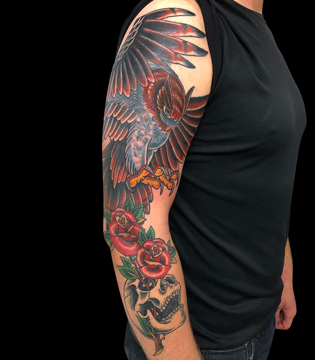 This week Gabe tattooed a traditional skull and bones on one of his regulars. Cody did some cherubs on a forearm. Colin put a moth on a client’s arm. Dan got to do a tradi rose on a dude’s leg. Phil did a Star Wars tattoo on a friend. Casey tattooed a wing on a guys arm. Have a look.