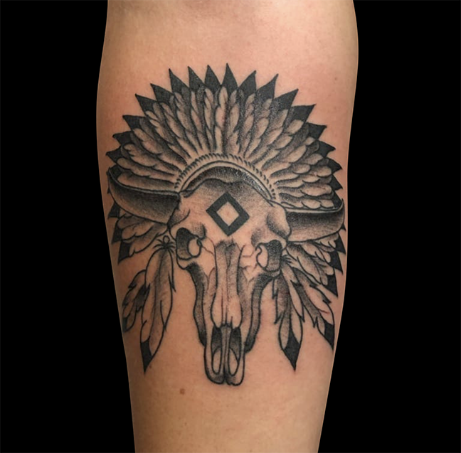 This week Gabe worked on a dragon sleeve. Colin, Jen, Dan and Pablo all worked on various floral tattoos. Casey got to do a cow skull with a head dress on an arm. Those and more below.