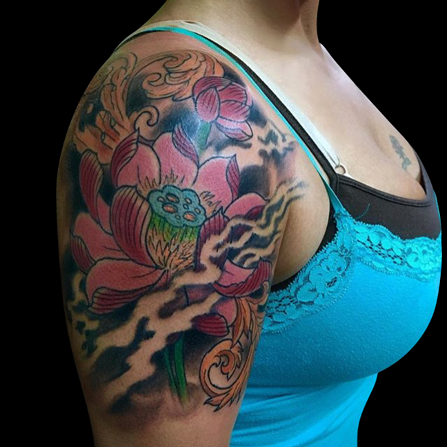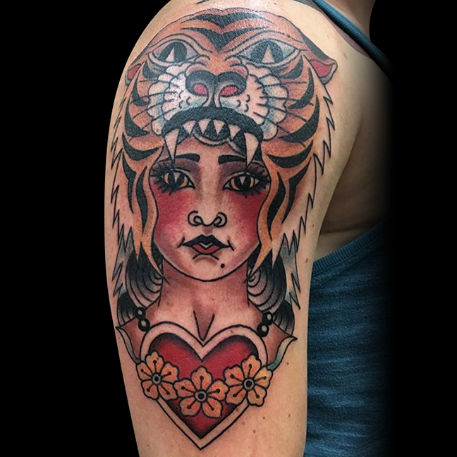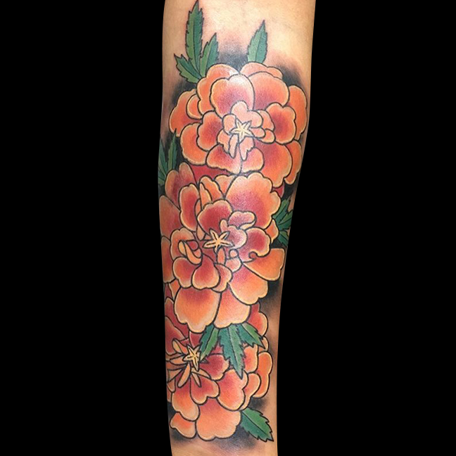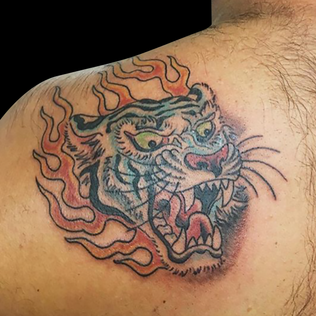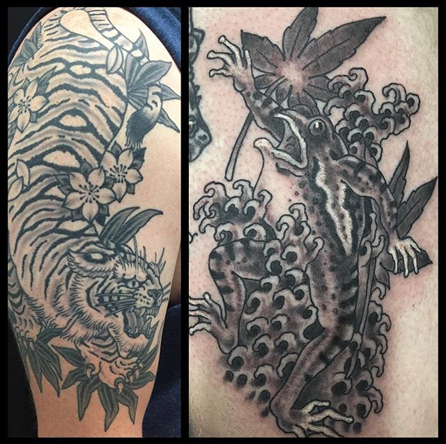 Thanks for checking out this week’s shop update. Gabe did a lotus half sleeve with filigree and smoke as well as la flor de cempasuchil on a forearm. Cody got to do some bacon and eggs skull and cross bones. He also did a black and grey Japanese tiger and frog. Lars tattooed a cool heart/dagger on a friend. Dan did a traditional skin tear snake and a black and grey arrowhead/landscape. Jason tattooed a floral bouquet with kid’s initials on a client’s arm. Colin got to do a traditional Lady Luck tattoo. Casey tattooed some mountains with text on one of his regulars. Felix got to tattoo a flaming tiger head on a dude’s shoulder and started a back piece. Enjoy the pics.