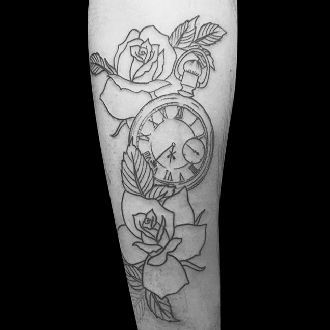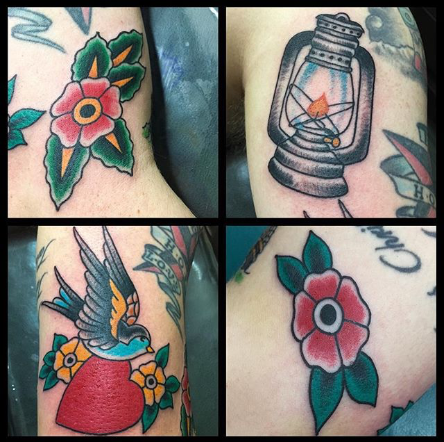 Cody tattooed a traditional rose and dagger on a girl’s chest. He also did a clipper ship and a black and grey mandala. Lars tattooed an aviator girl head on one of his clients. Colin tattooed some roses on a girl’s ribs. Dan finished a big clipper ship, did a shading session on a skull and tattooed some old english on a customer’s arm. Jason got to do some black and grey roses and a pineapple. Casey tattooed and ornate flower on a shoulder and outlined an ornate sun/moon on a client’s back. Phil tattooed a cod on one of his regulars. Felix outlined a pocket watch with roses, tattooed a bunch of diamonds on a girl’s arm, did a ladybug with a ribbon on a forearm and some text on a wrist. Enjoy the pictures.