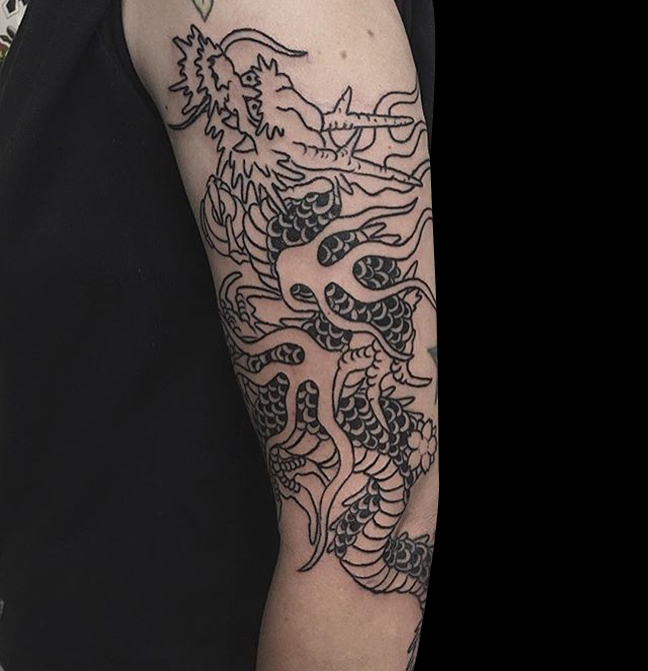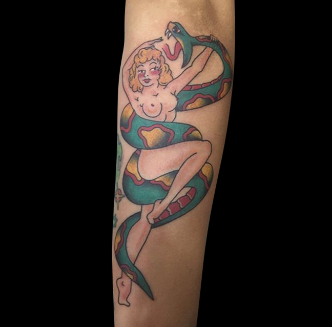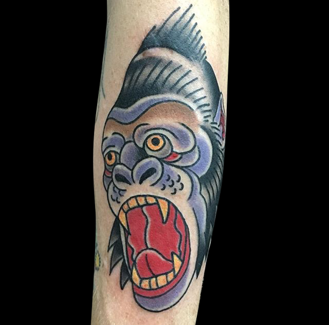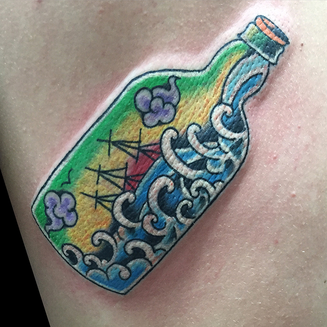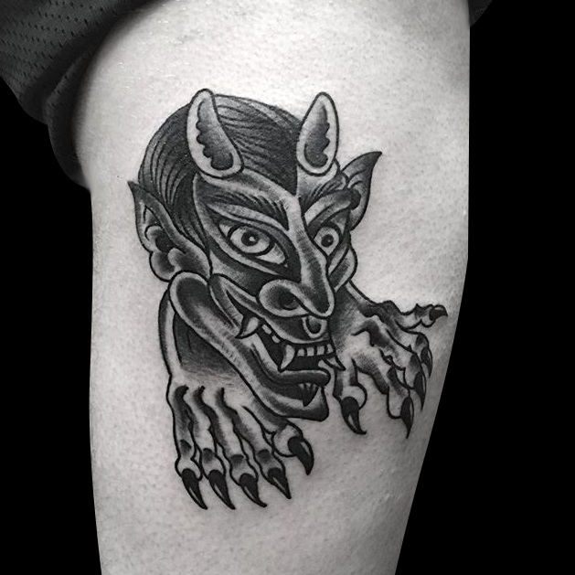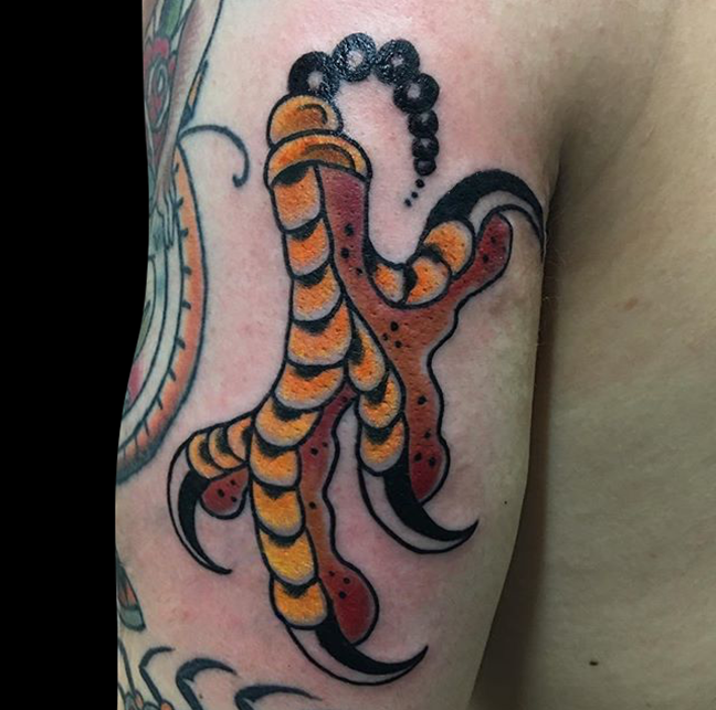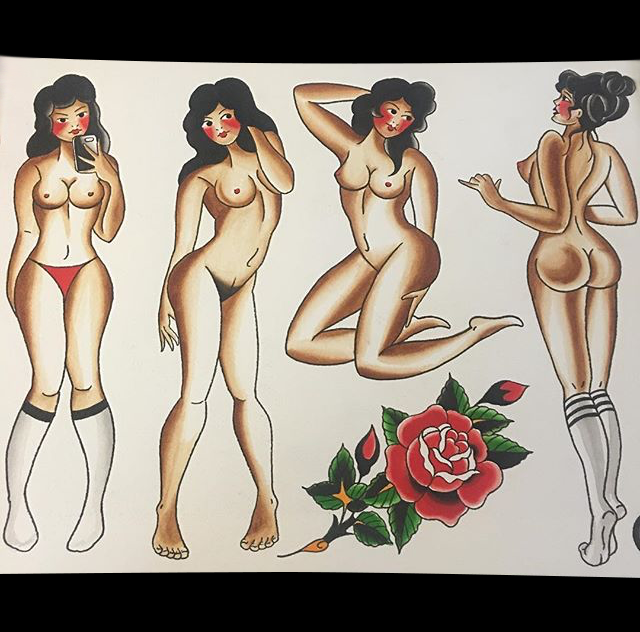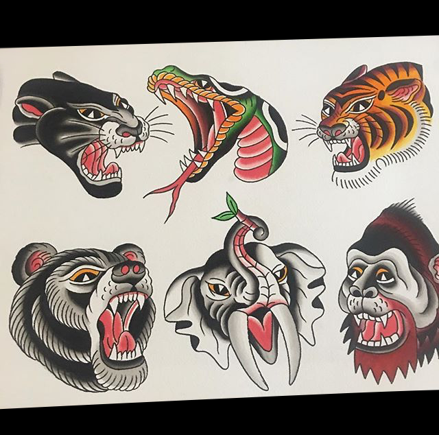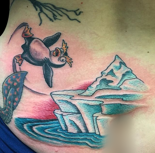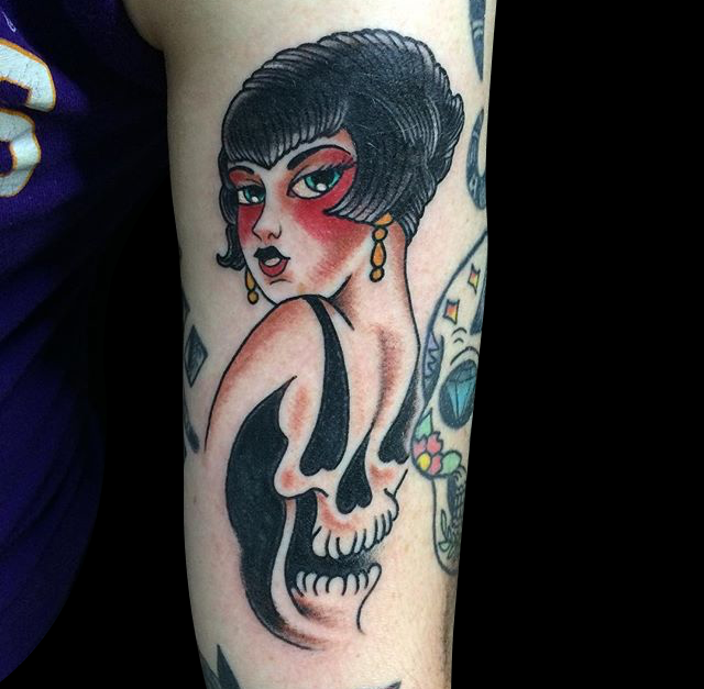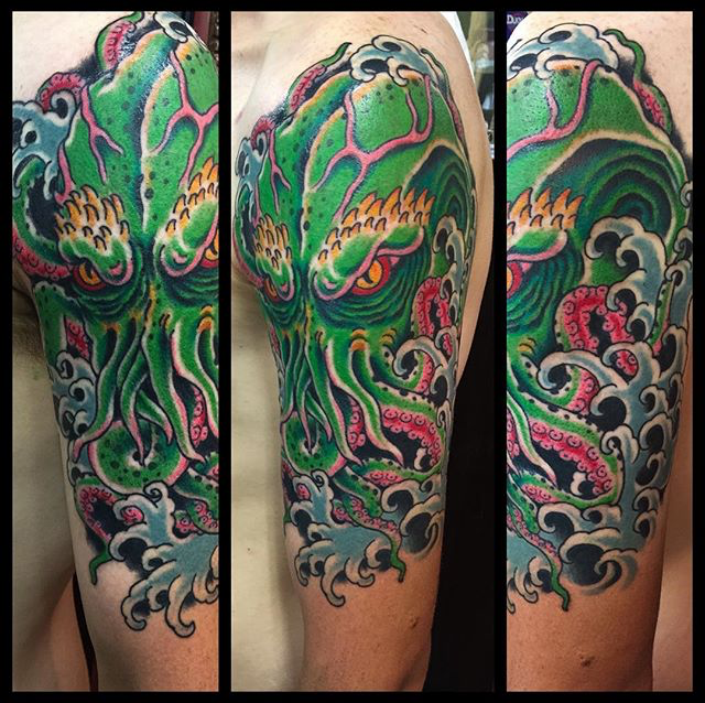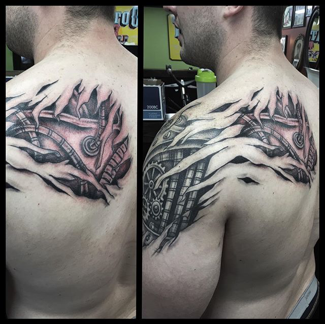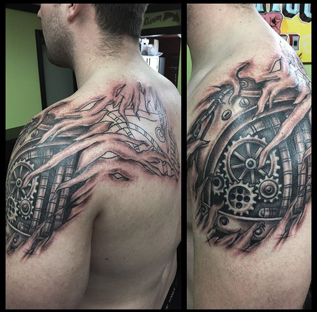 Hey guys, thanks for taking a look at the update this week. Gabe’s been out of town this week but before he left town he found some time to paint some new flash sheets for the shop. Cody worked on a biomech-skin-rip tattoo, a Japanese sleeve, a Polynesian half sleeve and a butterfly. Lars tattooed a penguin on a friend of his. Colin got to do a traditional devil head and a UFO. Casey tattooed a tomahawk on a forearm. Morgan got to tattoo a couple traditional bangers out in STL. Moe did a ship-in-a-bottle tattoo. Alysha tattooed a spider gypsy girl on one of her friends. Felix started a floral cover up. Enjoy the pics.
