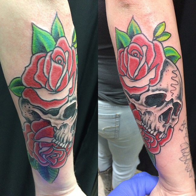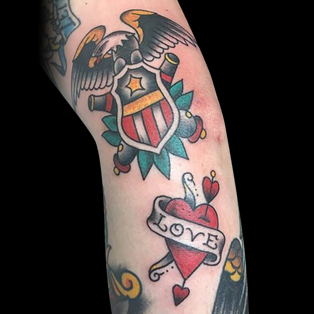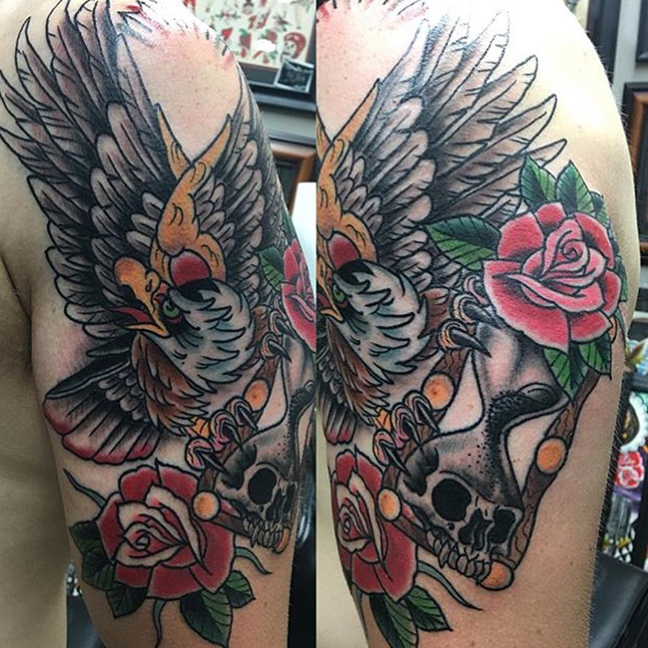 Thanks for checking out this week’s post guys. Gabe tattooed a traditional lighthouse and and elephant with roses. Cody got a healed pic of a black and grey angel he did awhile back. Colin tattooed a hand-sketched style lion head on a client’s arm. Dan tattooed a traditional tiger head/dagger. Morgan tattooed some knot work around a customer’s boob. She also got to do a black and grey rose. Phil tattooed an eagle on one of his customers. Moe got to do a sparrow and a cherub. Felix finished a cover up she started recently and did a small memorial tattoo on a customer’s ankle. There it is guys, enjoy the pics.