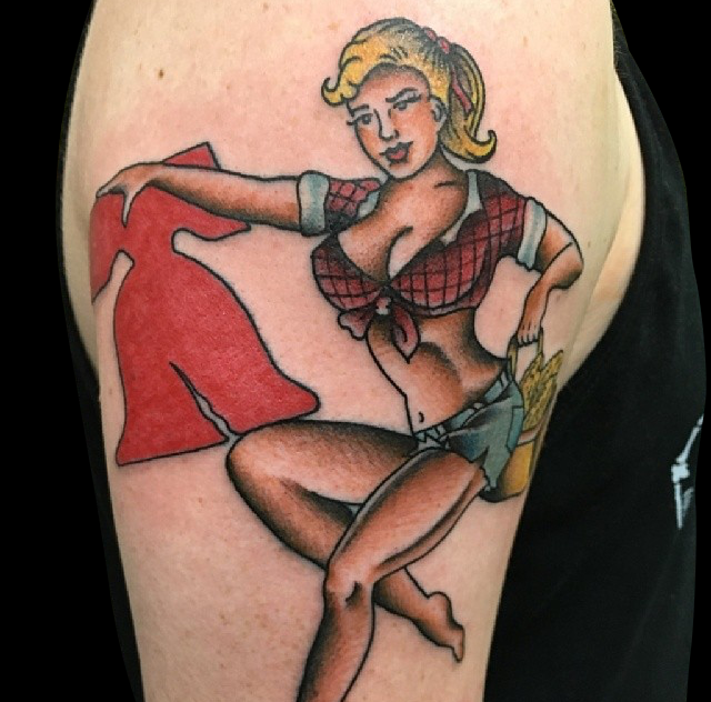 Here we go guys, I got another shop update for you. Cody did another session on a Wizard of Oz sleeve and outlined a floral half sleeve. Lars tattooed a lily with a geometric background. Morgan got to do a pin up out at All Star in STL. Dan did a Belted King Fisher tattoo along with a traditional black and grey anchor with a message in a bottle. Phil was really excited to get to do a Doomsday Bonnet tattoo. Felix got to do a little girl head/Eiffel Tower on a customers Ribs.