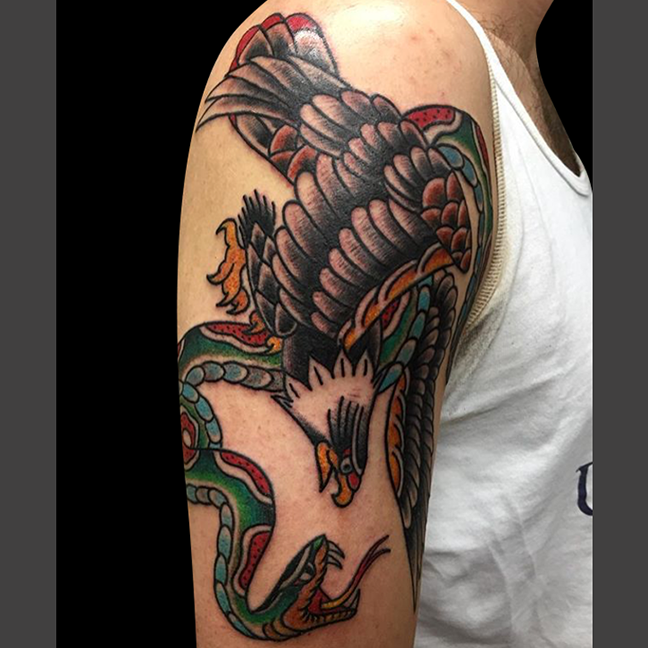 Hey guys, thanks for checking out this week’s update. Gabe lined out a huge Snow White tattoo on one of his regulars. Lars tattooed a panther and rose on a customer’s hand. Cody tattooed some nice script with filigree across a customer’s back. He also got to do a traditional sparrow with a heart, a lantern and some flowers. Colin got to do a black and grey spider. Dan finished a Kraken/ship half sleeve, tattooed an eagle fighting a snake and did a military memorial tattoo. Casey tattooed a panther on a dude’s hand and a Bob Omb tattoo from Super Mario. Jason tattooed a moon and sword with a watercolor background as well as some roses on a couple different clients. Phil tattooed a fun little UFO with a space background. Felix got to tattoo a rose and cross with a name, a rose on a hand, a cross on an arm and a Winnie the Pooh tattoo. Have a good week guys.