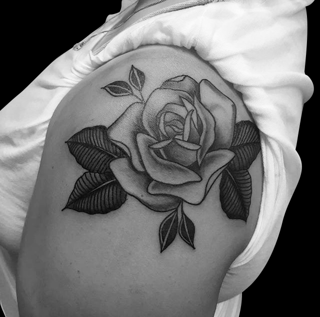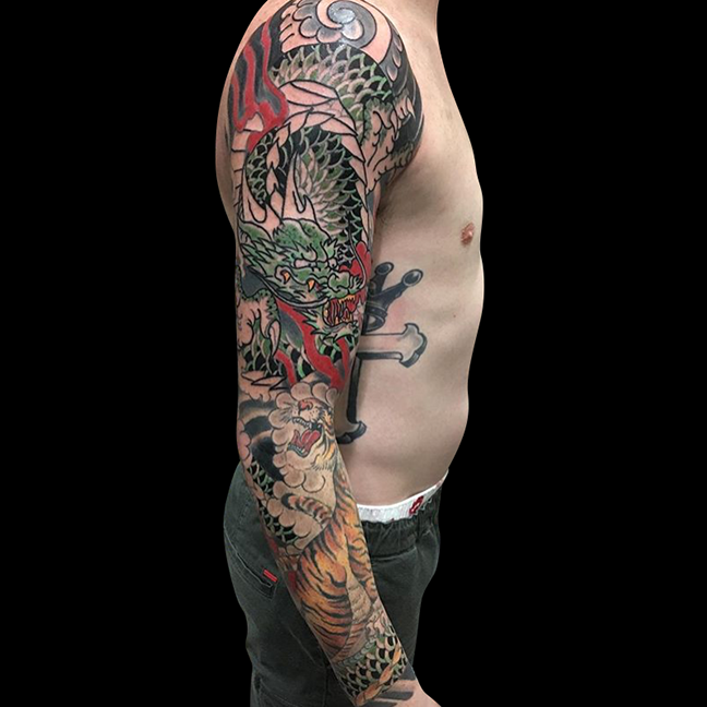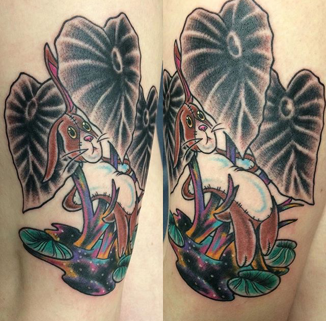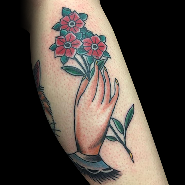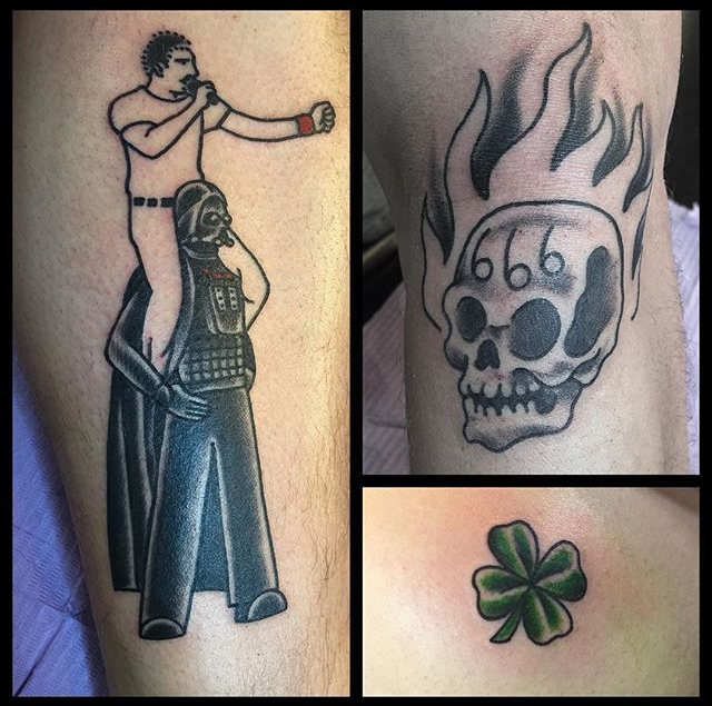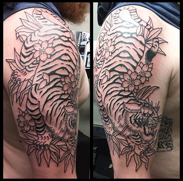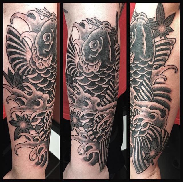 Well here we are again guys, it’s Tuesday and I’ve got another shop update for you. Gabe finished a dragon half sleeve and a black and grey gypsy girl/moon. He also did a traditional mermaid and a ship. Cody did a black and grey koi and started a tiger half sleeve. Colin tattooed a frog playing a banjo. Phil started an anatomical Ganesha back piece. He also tattooed an Alice in Wonderland illustration and a big mandala. Dan tattooed a heart in a bottle, a traditional hand with flowers, an arrowhead behind an ear and a midwest hardcore tat. Morgan tattooed the Duck Hunt dog on a customer’s waist. Moe tattooed a flower on a client’s arm and a Buddhist symbol on a sternum. Casey tattooed a sugar skull on a leg. Alysha got to do a black and grey rose. Felix did some small flowers with text on a ribcage. Have a good week guys.