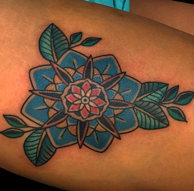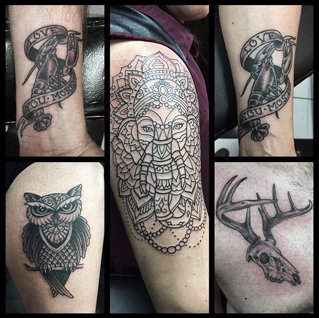 Thanks for taking a look at this week’s update. Gabe got back from LA this week. He did another session on a sleeve he’s had in the works for awhile. I’ve got pics from his guest spot at Spotlight as well. Lars got to do a wizard tat and a bearded lady. Cody outlined a Ganesh half sleeve and tattooed some lobster bro tats, an owl and a deer skull. Colin tattooed a nail cross with flowers and a black and grey landscape. Dan tattooed a tiger head on a knee cap and finished a painting. Alysha did a huge mandala stomach tat and a landscape wristband. She also got a healed pic of a native girl head she did. Moe tattooed a panther head and a cardinal. Enjoy the pics.