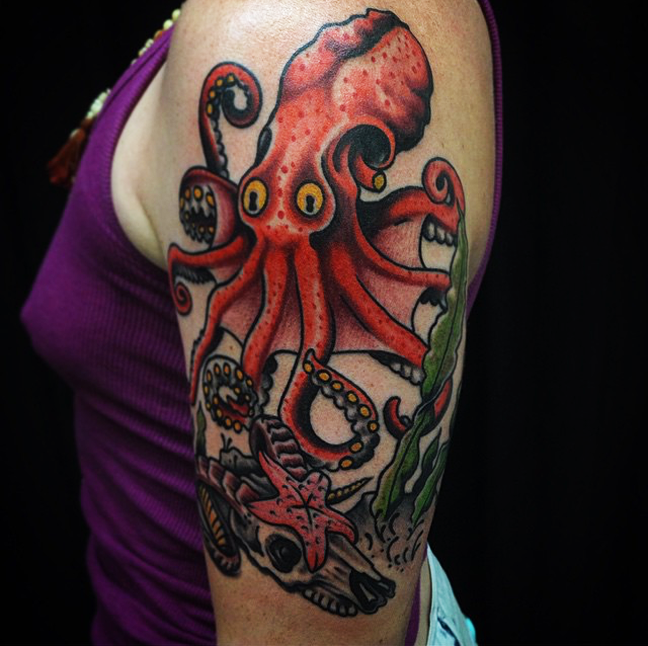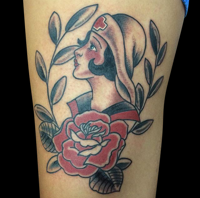 Hey guys, here’s the weekly update. Gabe just got back from tattooing out in IL for a few days. While he was there he outlined a traditional 3/4 sleeve and tattooed a snake and dagger, floral moon/eye and an impaled kewpie head. Lars was in TX all week visiting different shops. He did a really cool traditional octopus while he was out there. Cody did the last session on a gypsy girl head he’s been working on. Kasper tattooed a sugar skull for a walk-in on Saturday and finished another painting. Phil got to do a big Rose of No Mans Land on one of his regulars. Dan tattooed the Slayer logo on our friend Patience. Have a good week guys, see ya next time.