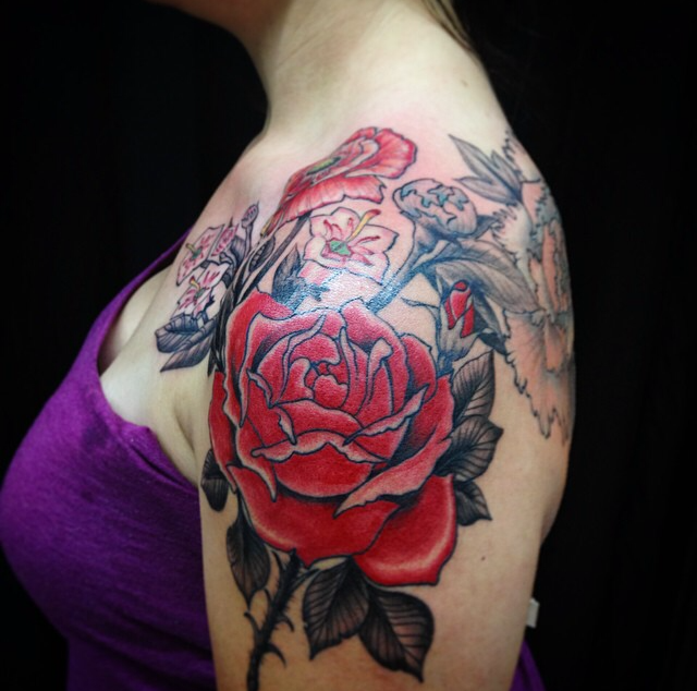 Well it’s Tuesday again so here’s your weekly dose of Iron Tiger stuff. As usual, Gabe had some large pieces in the works including the skull/rose shoulder tat in the pics below. Colin made some progress on a half sleeve he’s been working on and got to do some cool traditional flash on a walk-in. Cody did a sick Viking Girl on a customer over at Tattoo You. Lars had a decent amount of appointments this week including a nice traditional anchor/rose. Moe got to do a Reaper on a walk-in client on Saturday. Morgan did a fun little crystal cluster on Lars’s wife Tiffany. Cody, Lars and Casey all cranked out some rad new flash.