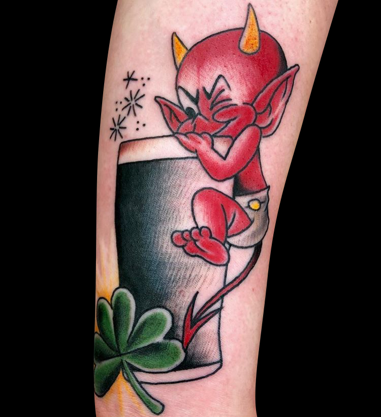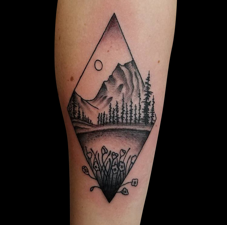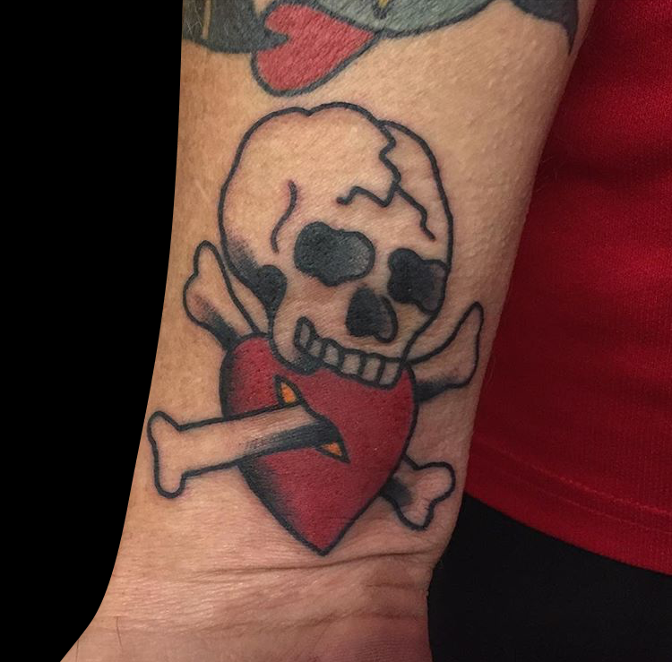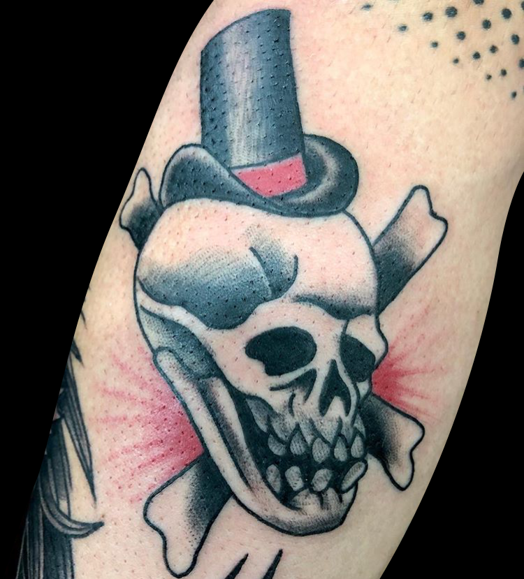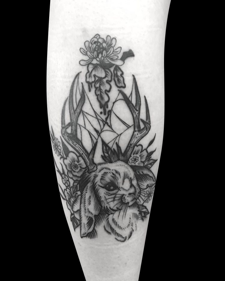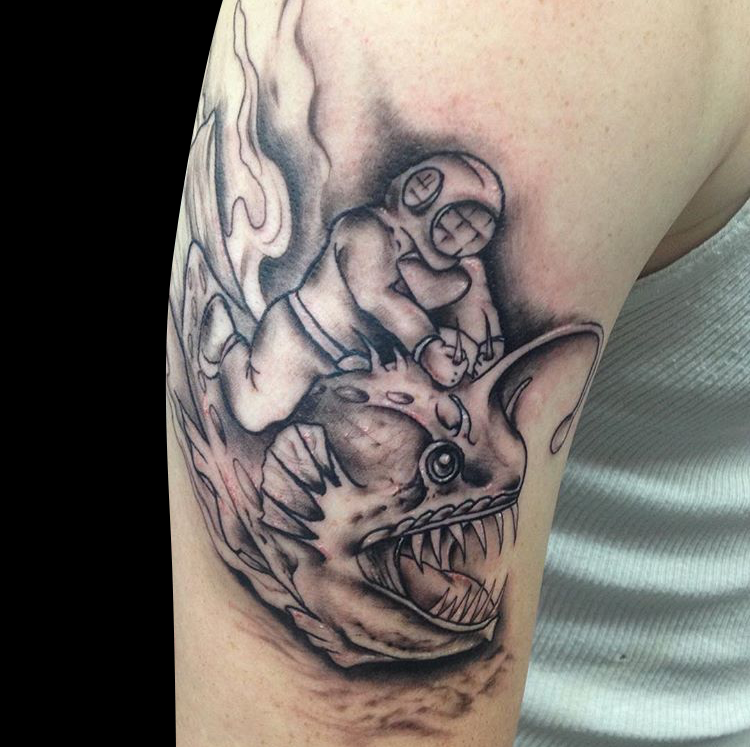 This week Gabe did a cool skull and bones on a client’s arm. Cody did a tribal half sleeve that he drew on. Colin worked on some black work tats including a Jackalope with flowers. Dan got to work on a bunch of rad traditional tats. Casey did a diamond-framed landscape tattoo. Pablo tattooed an angler fish and diver on a dude’s arm. Scroll down and take a look.