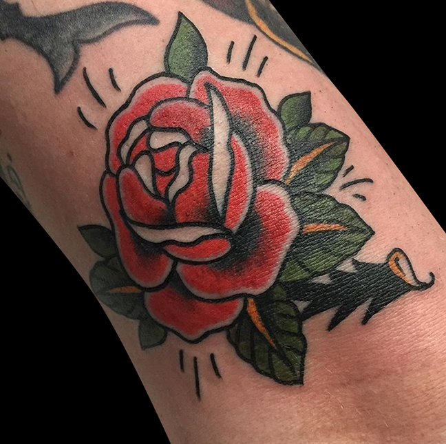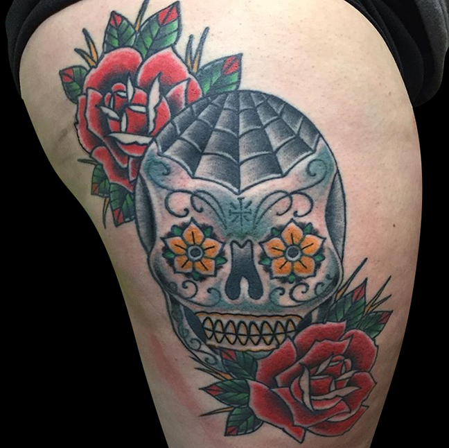 Got another shop update for ya, here we go. Gabe got to do a traditional dagger/skull tattoo along with a Dachshund tattoo. Cody outlined a pirate ship on a client’s thigh and finished painting a Polynesian tribal skateboard. Colin tattooed a skull inside a clover on one of the counter guys. Dan did a rose band under a client’s knee. Jason did a floral sternum tattoo, a traditional shield and a rose on a hip. Felix got to do several different rose/floral tattoos. Take it easy guys.