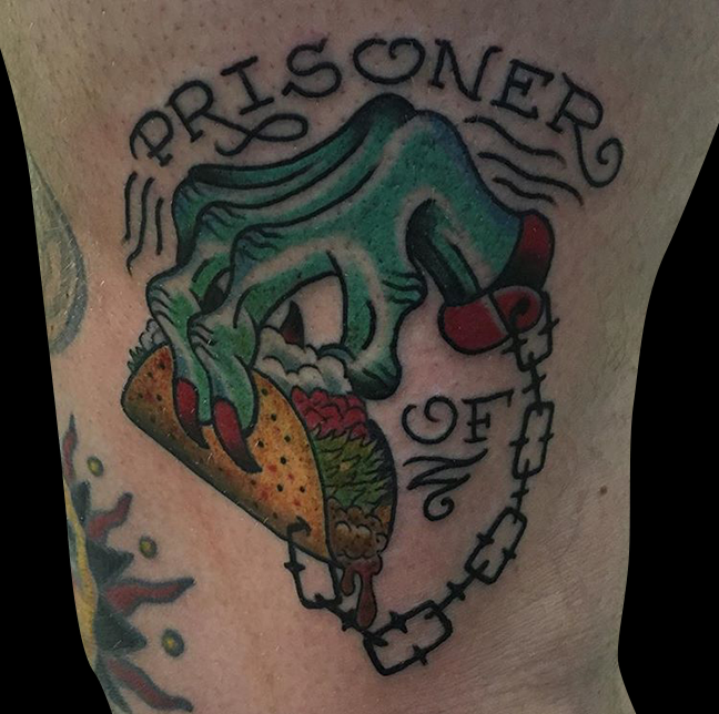 Hey guys, we’ve got a lot of tattoos to cover this week so lets get to it. Gabe got to do a huge traditional eagle, globe and anchor tattoo. He also made some progress on a floral sleeve and a buddha half sleeve along with a Mexican pin-up and a black an grey/color peony. Cody did a gorilla portrait to start out a guy’s half sleeve along with a Harry Potter owl and a panther head. Lars got to do a tattoo of a hand chained to a taco. Colin tattooed a reaper on a forearm. Dan finished a sugar skull with roses on a customer’s thigh. Jason tattooed a black and grey traditional anchor with a ship and lighthouse on a walk in. He also tattooed some coffee beans on a friend of his and did a little devil heart on a walk-in. Phil did a snake and skull on a friend of ours along with a Miyazaki tat, a campground scene and a poppy. Casey tattooed a skin rip dagger on a customer’s arm. Felix got to do a pin-up, a minimal mountain range and some bird silhouettes with text. Pictures below, enjoy.