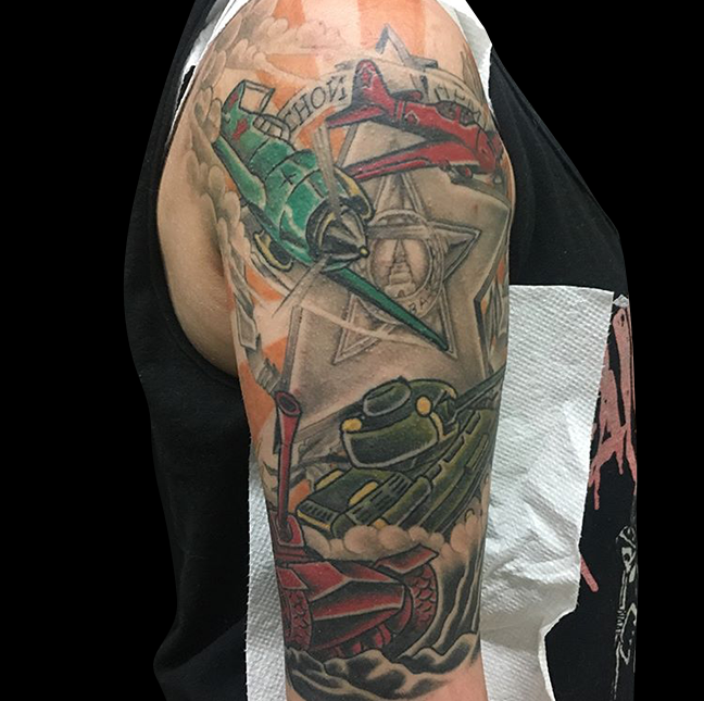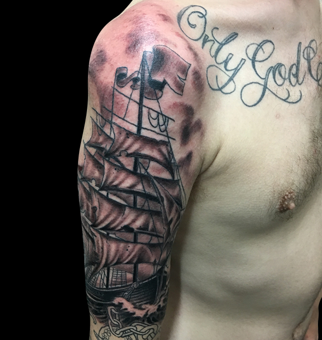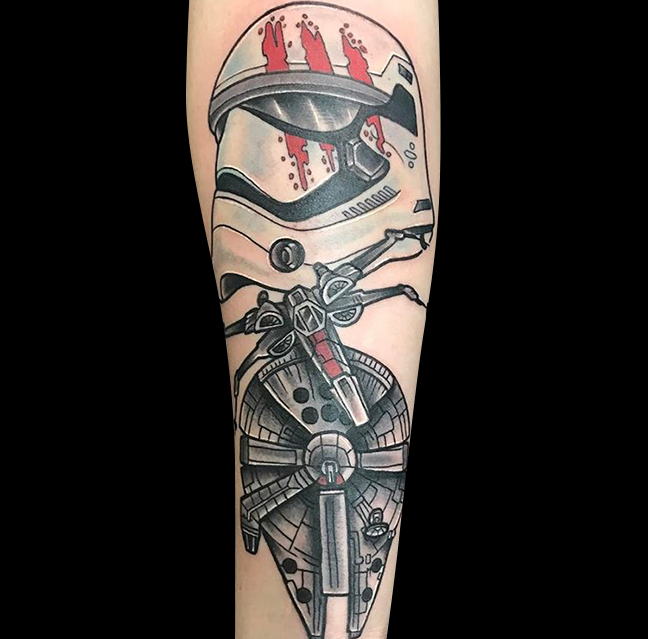 This week Gabe finished a soft black and grey floral sleeve with color accents, did a session on a clipper ship and tattooed some names on a clients back. Cody worked on some cool tattoos including a black and grey skull, a traditional girl head, a Polynesian tribal sleeve and a koi with cherry blossoms. Lars worked on our friends soviet battle scene half sleeve. Jason got to do a black and grey heart/eye. Phil had a lot of fun tattooing a storm trooper/x-wing/millennium falcon tattoo on one of his regulars. Colin got to do a rad skull and cross on a dude’s arm along with a small flower. Felix tattooed a watercolor dragonfly on a walk-in.