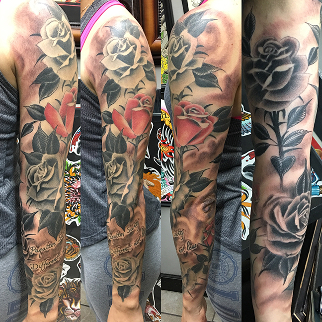 Here’s what we’ve been up to at the shop. Gabe did a black and grey tattoo for our friend’s grandfather and a tradi clipper ship. Cody did a session on a lion chest piece, tattooed some black and grey roses on a dude’s arm and outlined an ornate lotus. Dan tattooed a native head as a cover up on an arm. He also got to do a little Sailor Jerry duck on a regular. Colin got to do a scorpion tattoo and a letter with flowers. Jason did a culinary tattoo, text on his friend’s knuckles and some love dolphins. Casey tattooed a floral piece symbol on a girl’s arm. Felix tattooed a butterfly/tiger and hand outlines. Moe got to do a linework face and rose.